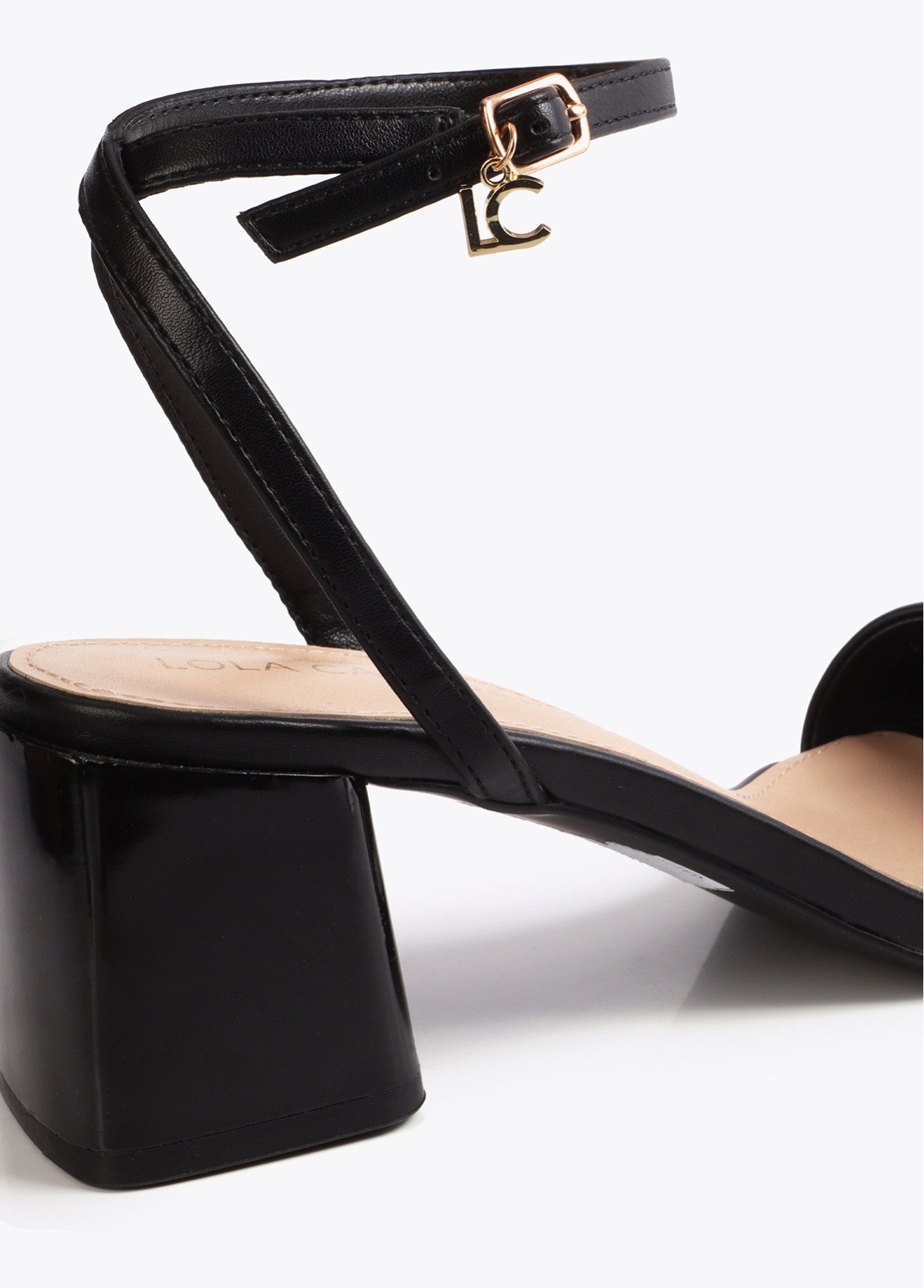 Black Block-Heeled Sandal with Gold Metal Embellishment
