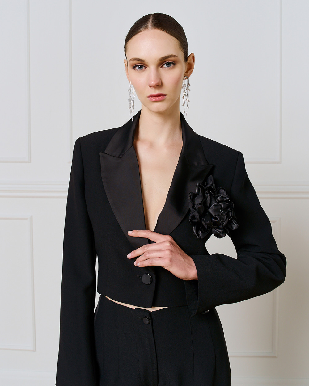 Cropped blazer with a detachable flower brooch. It features a notched satin lapel collar and front button closure. Style with the matching tuxedo trousers for a complete look.
