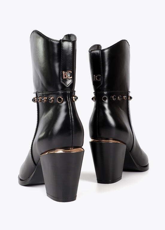 Cowboy heel boot in black leather with exclusive metallic details. Side zipper closure. Sturdy 7cm heel. Decorative metallic applications on the ankle for a bold, modern style. Comfort and fashion in every step. Ideal for any season.