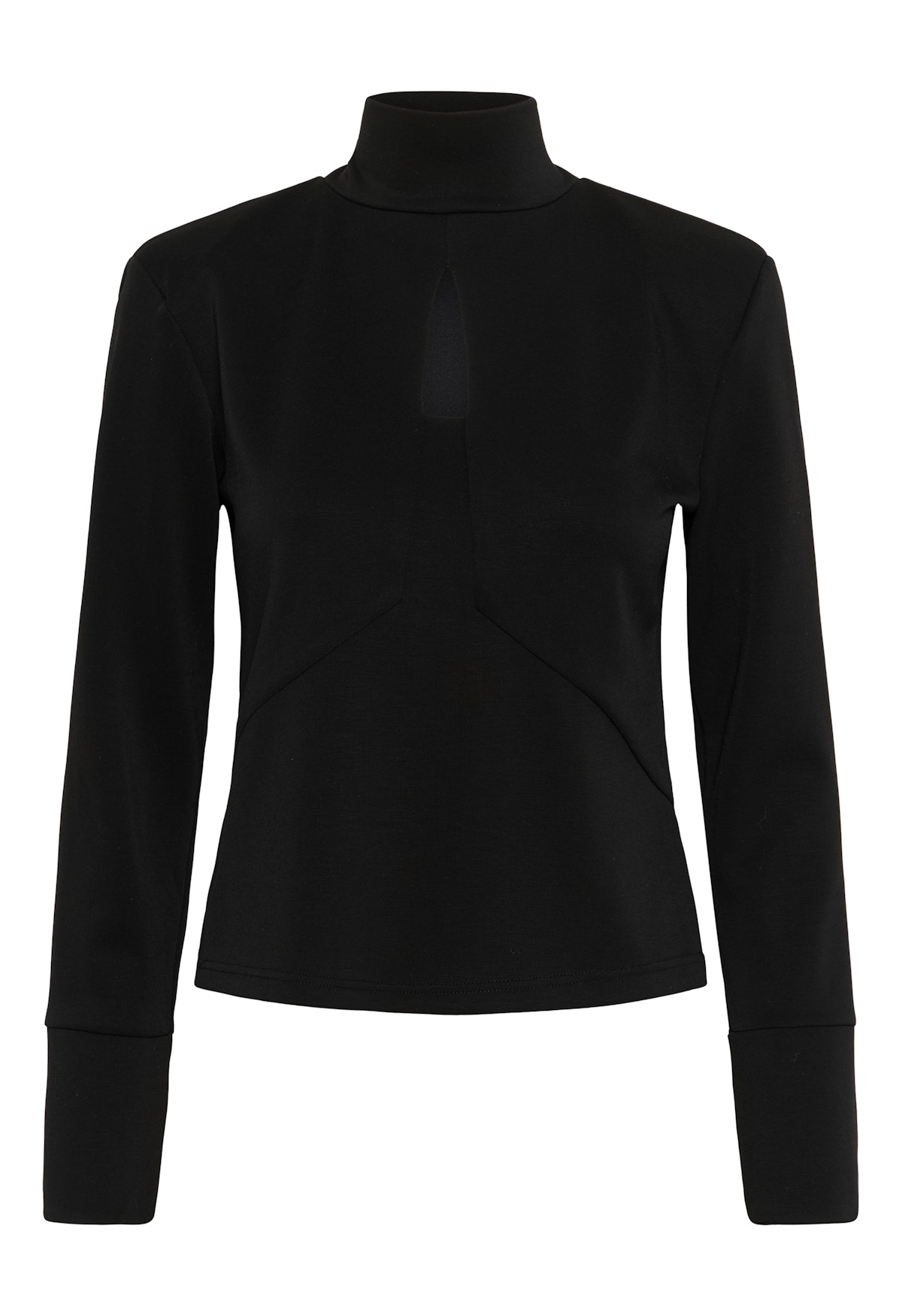 This fitted turtleneck top with shoulderpad features a sleek silhouette, long sleeves, and subtle cut-out detail at the neckline. Comfortable stretch fabric ensures ideal wear for both professional and casual occasions, making it highly versatile. Style for day or night.