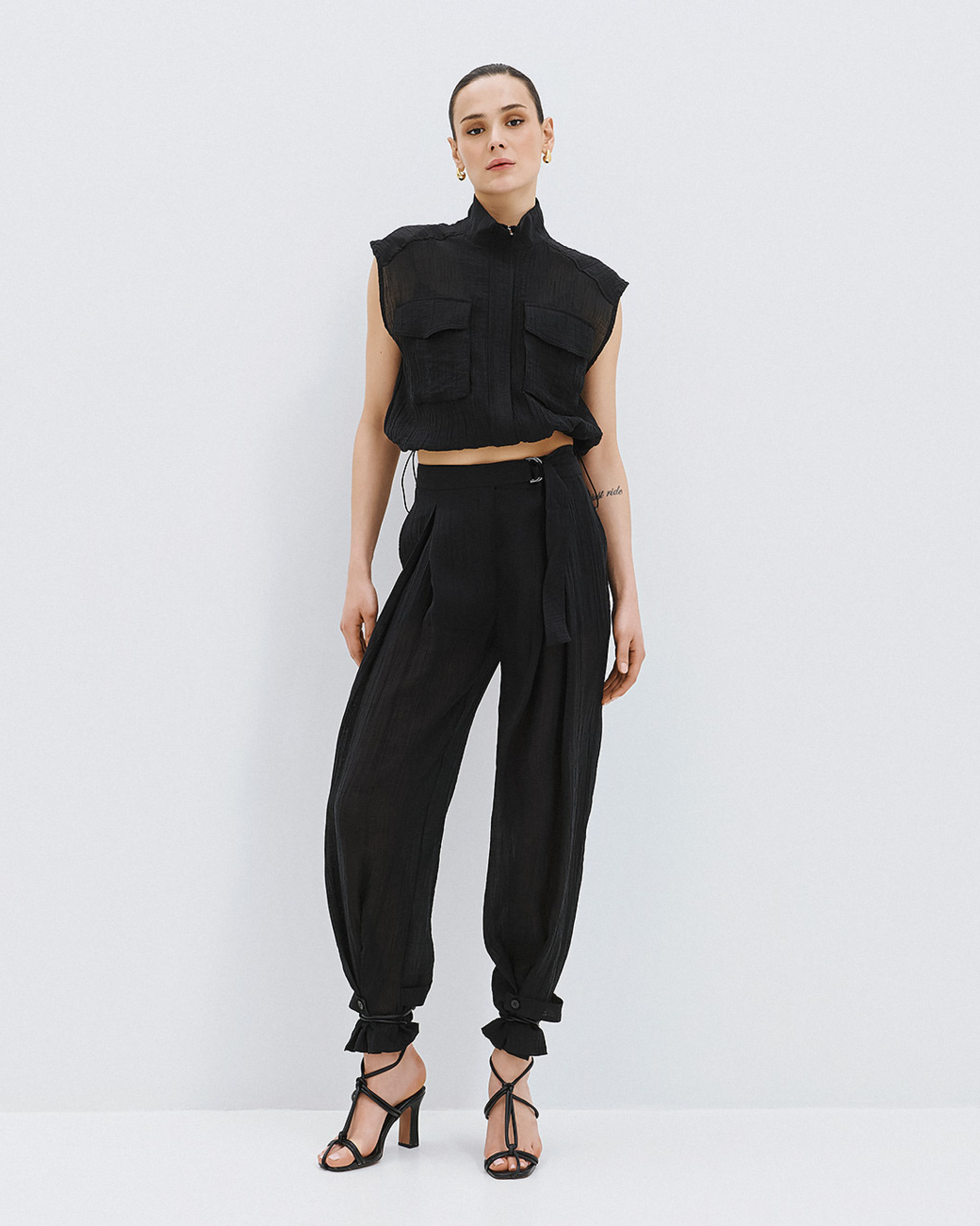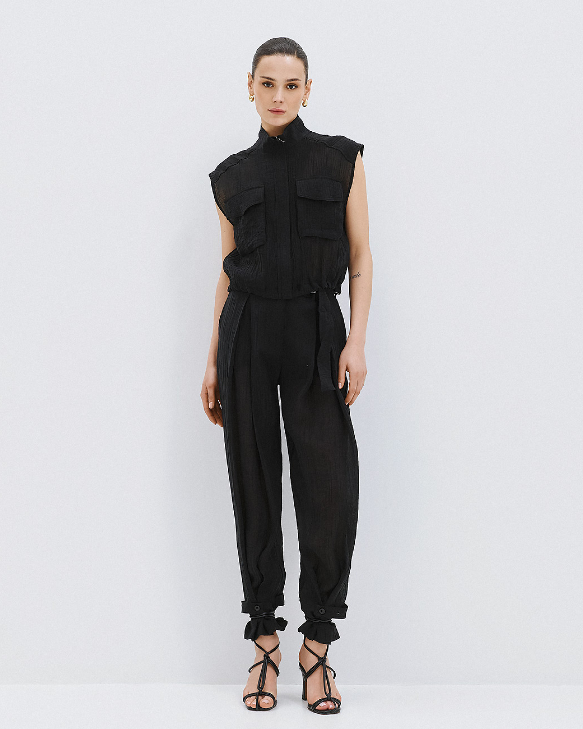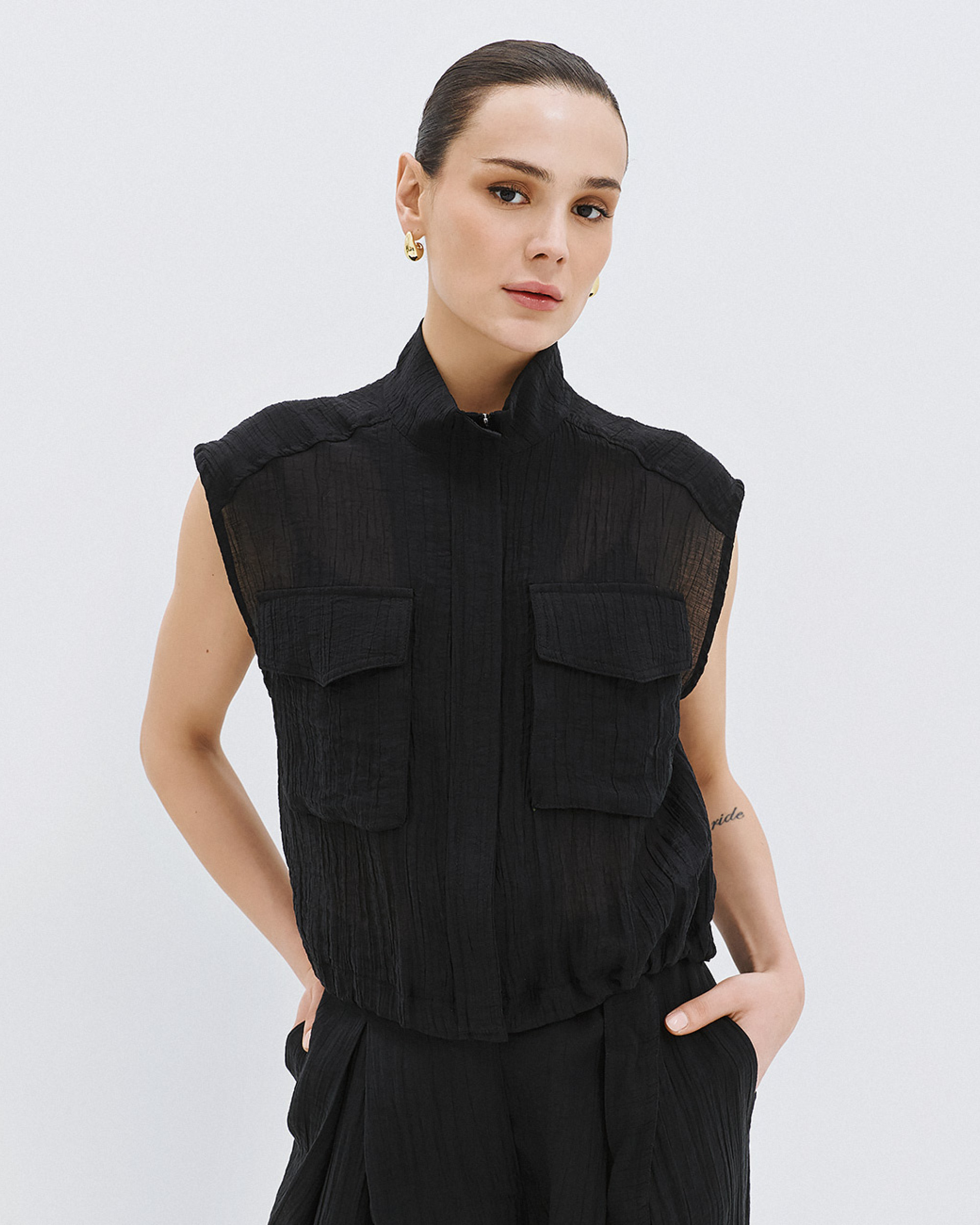 Black semi-sheer military style top with front patch pockets, funnel neck and parachute tie waist. Style with the matching trousers for a complete look.