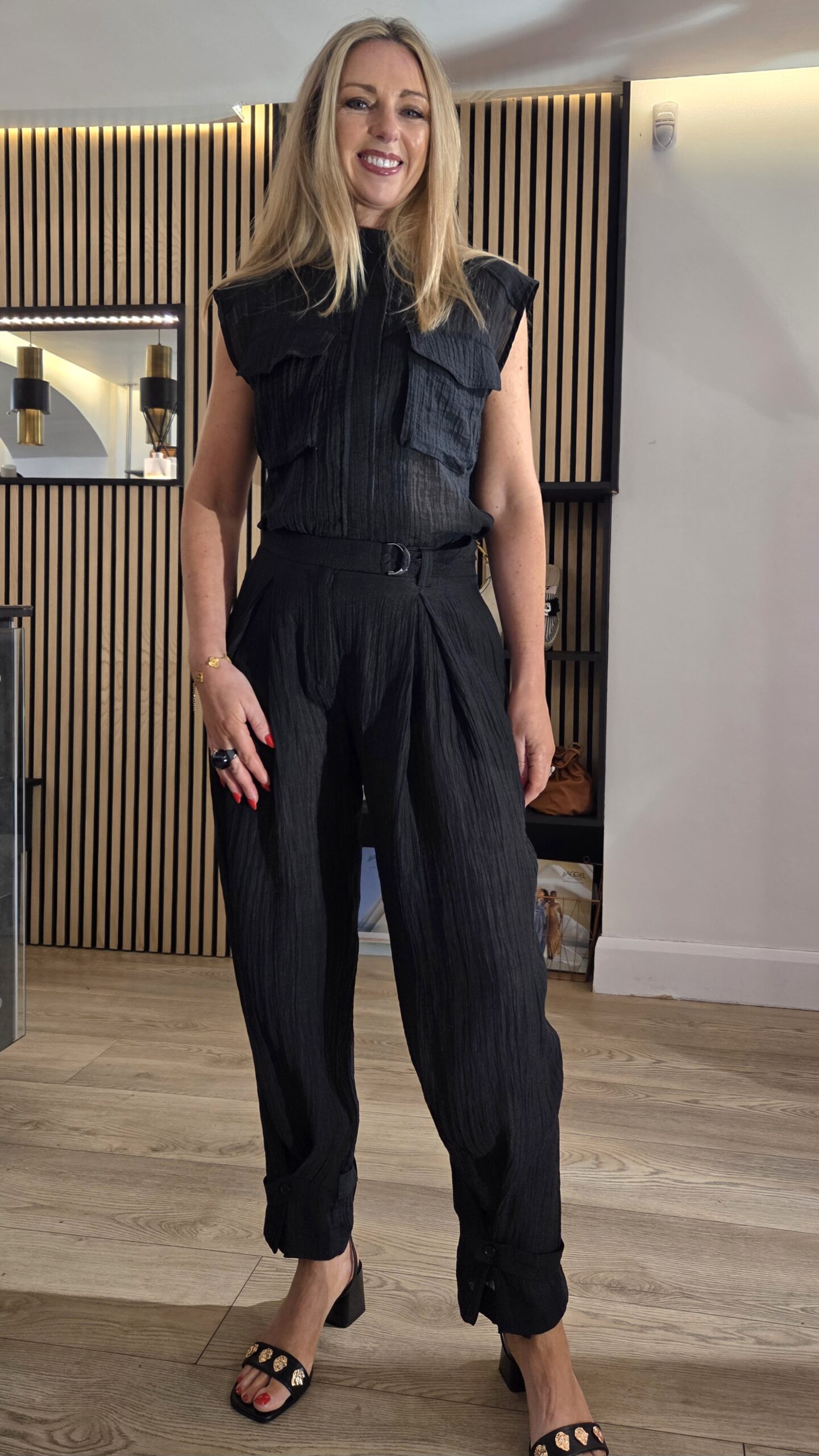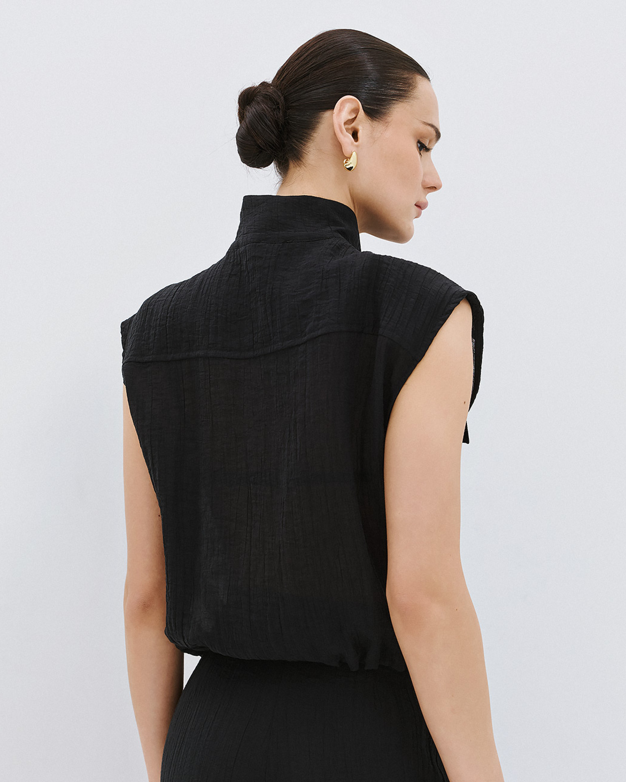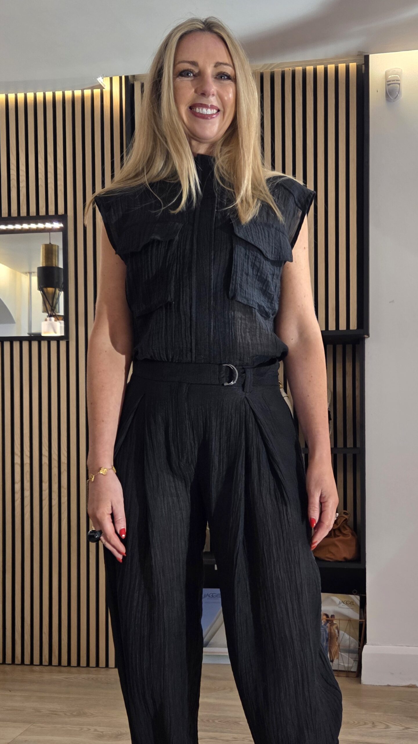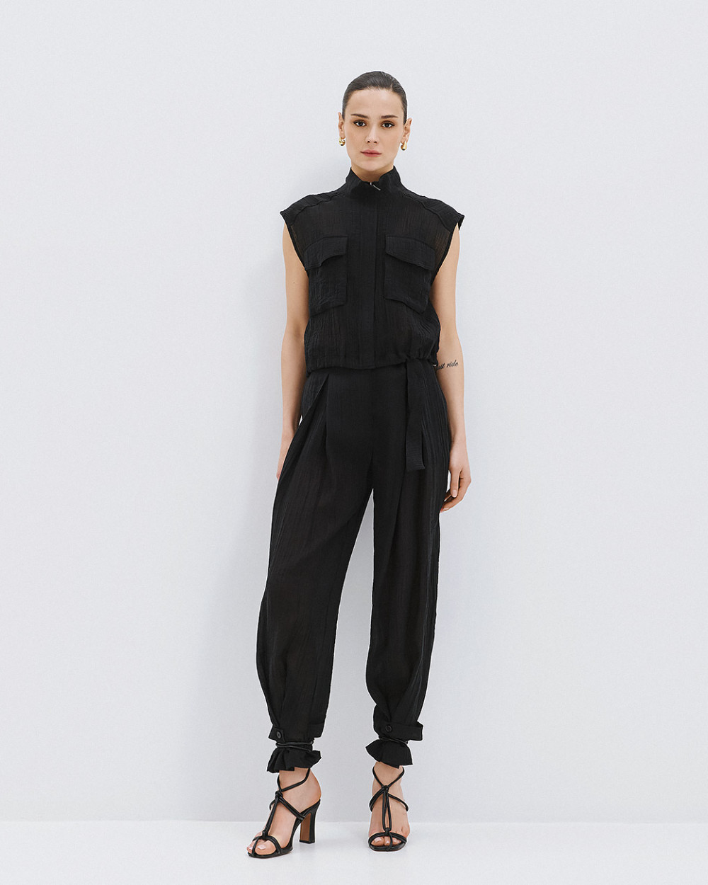 Black semi-sheer military style top with front patch pockets, funnel neck and parachute tie waist. Style with the matching trousers for a complete look.