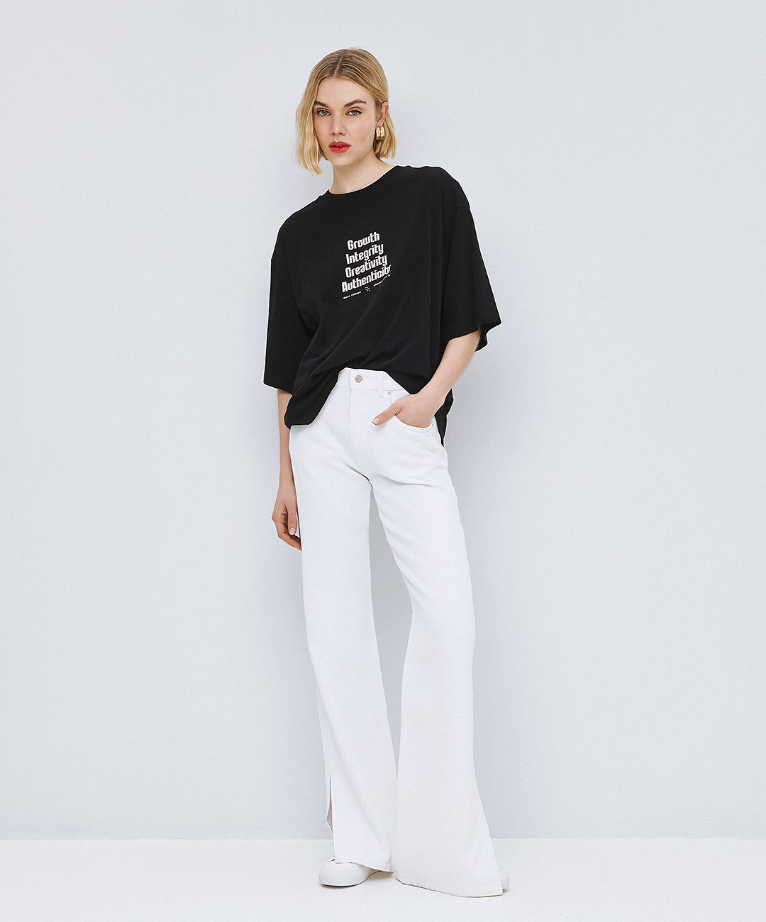 Short-sleeved over-sized cotton t-shirt with a round neckline and print at the front and back. Also available in white.