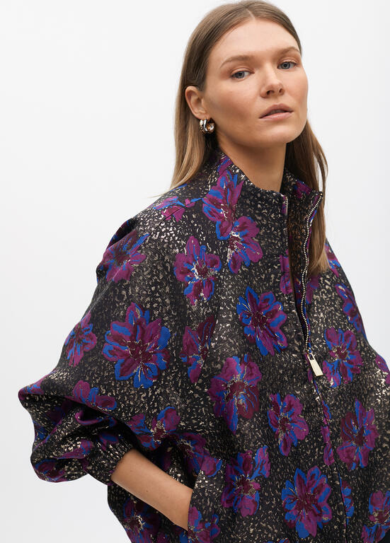 Bomber jacket in jacquard fabric with metallic floral pattern. Zip closure and raised collar. Long sleeves with elastic cuffs. The fabric in this bomber jacket is stunning. Style with a simple white t-shirt and indigo denims for a effortless going out look.