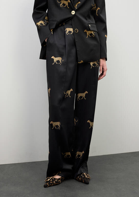 High-quality satin shirt with an elegant leopard print. Classic collar and long sleeves with button closure. Soft and flowing fabric for comfort and sophistication. Style with the matching trousers for a complete look.