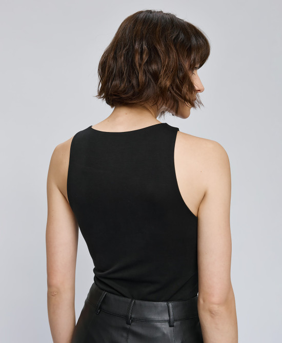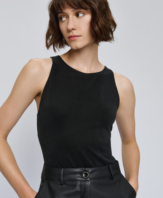 Sleeveless bodysuit with a round neckline. The fabric of this bodysuit feels incredible. This is a definite wardrobe staple piece.