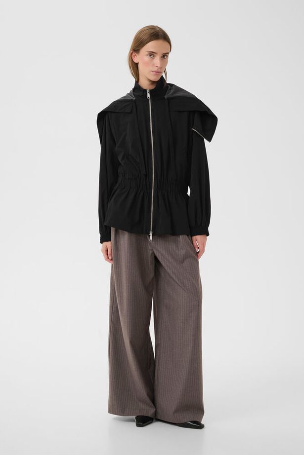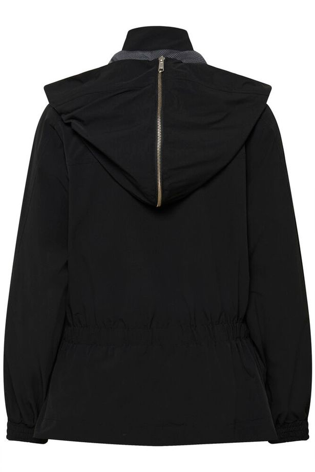 Black Track Jacket with Gathered Waist and Zipped Cape/Hood