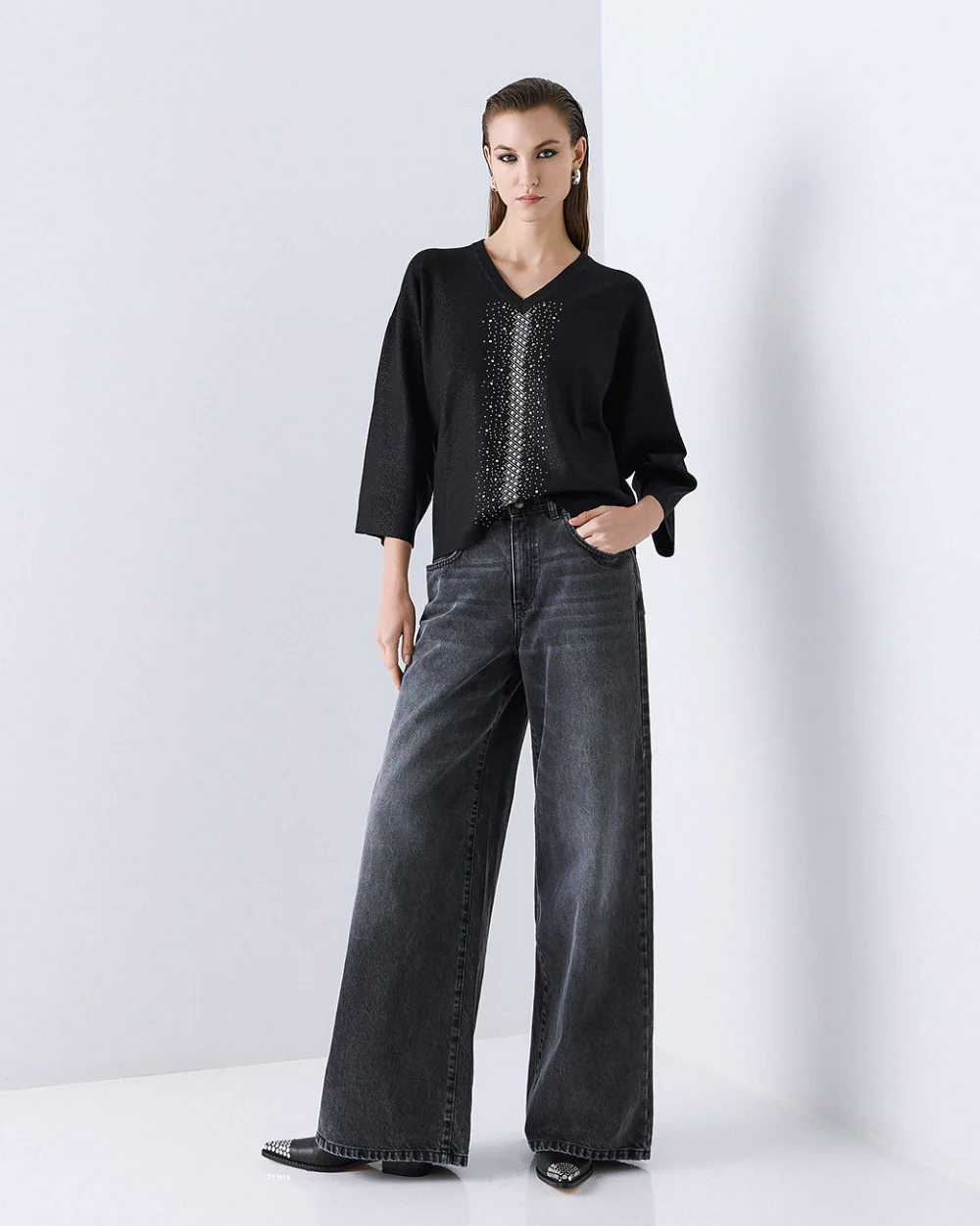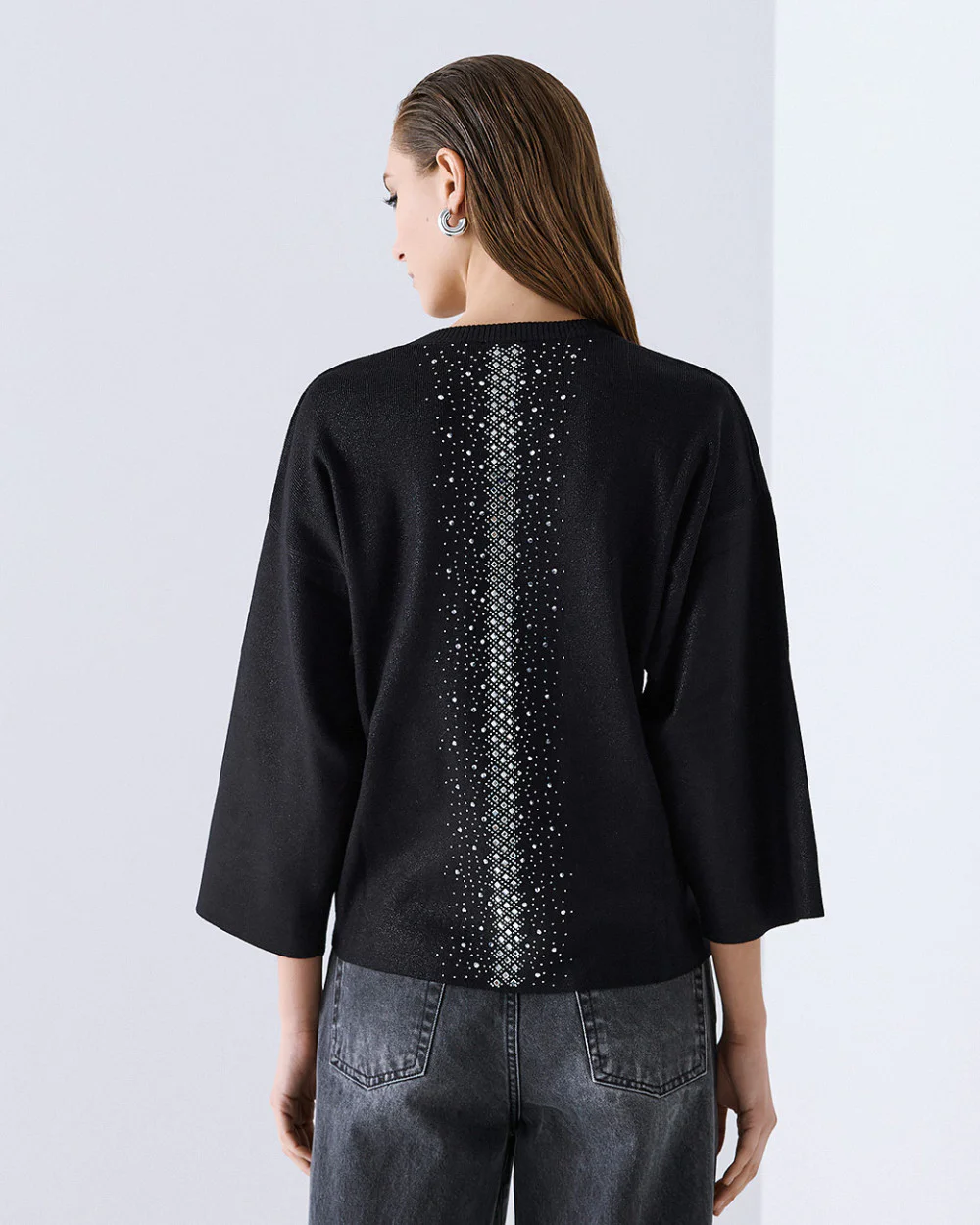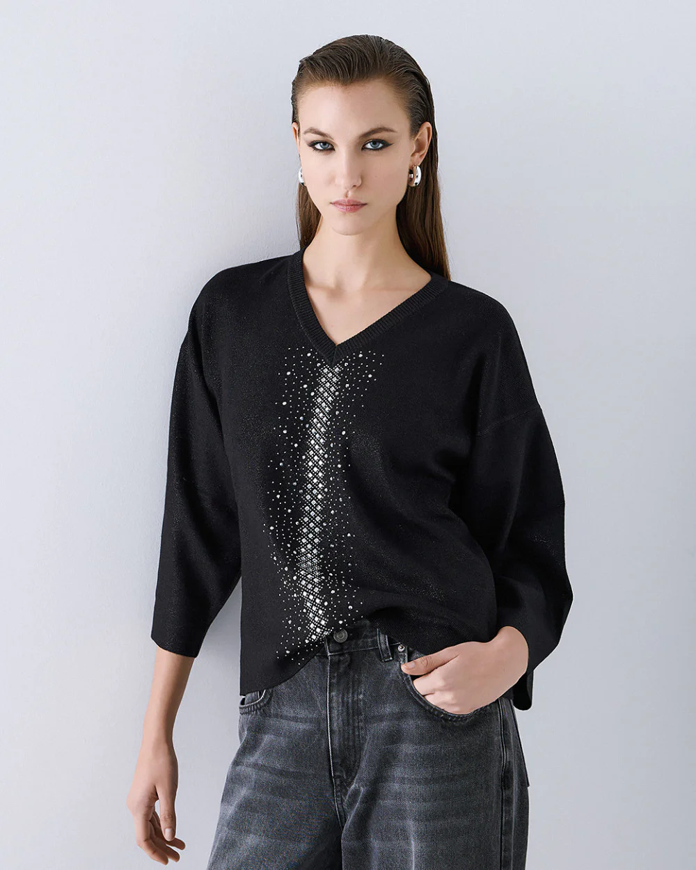 Lurex knit with rhinestone details. It features a V-neckline and long wide sleeves. Style for day or night.