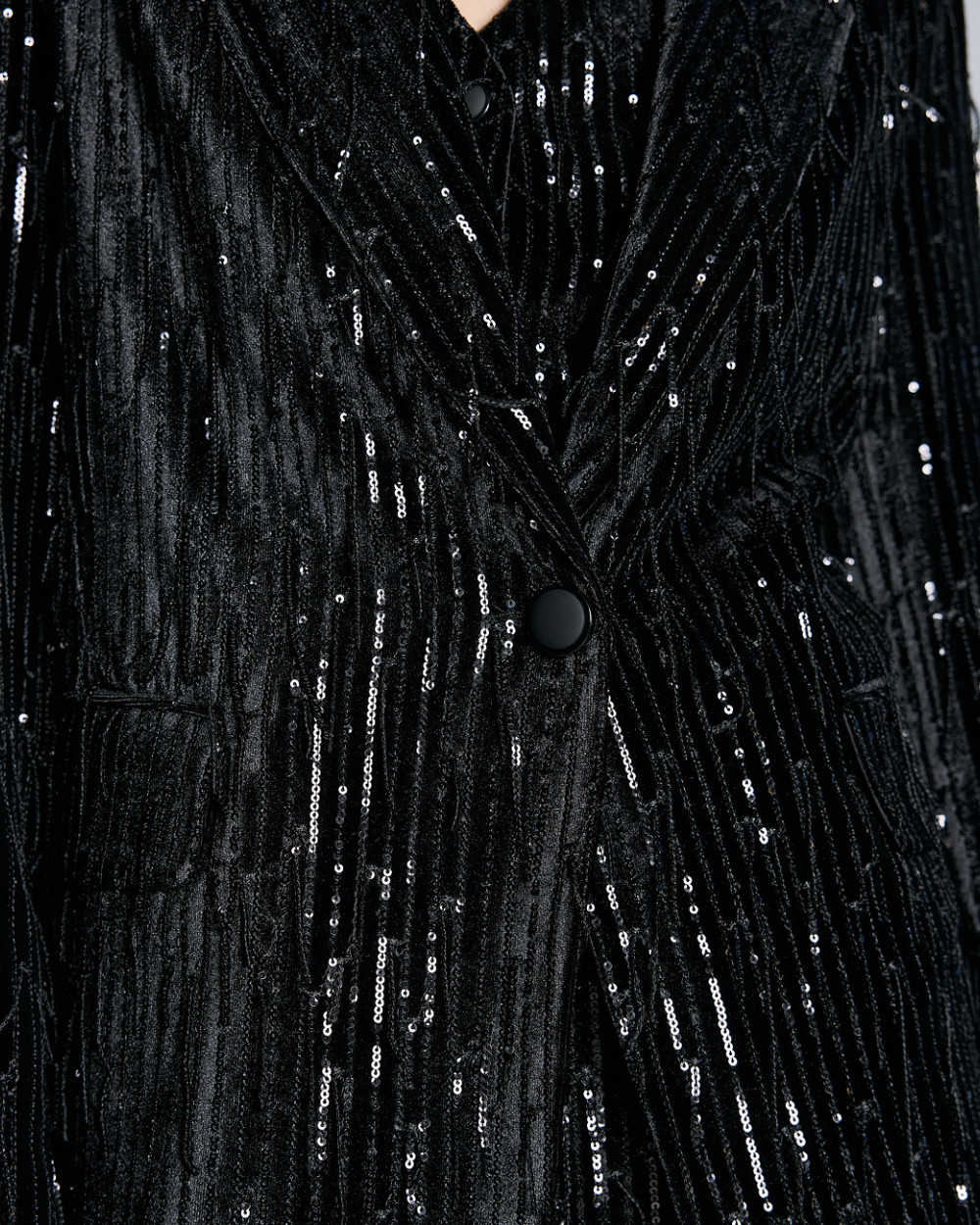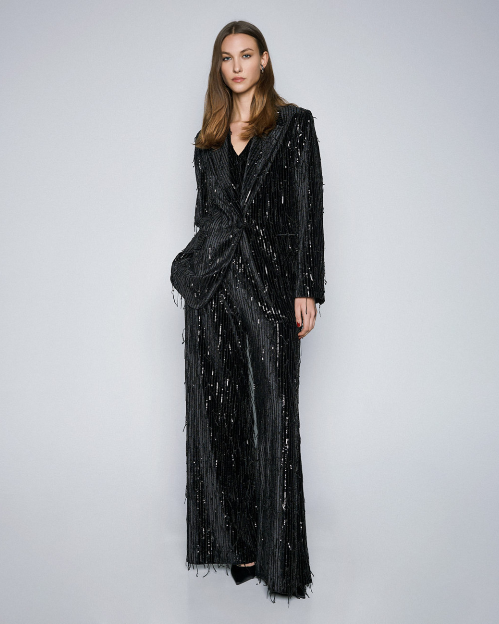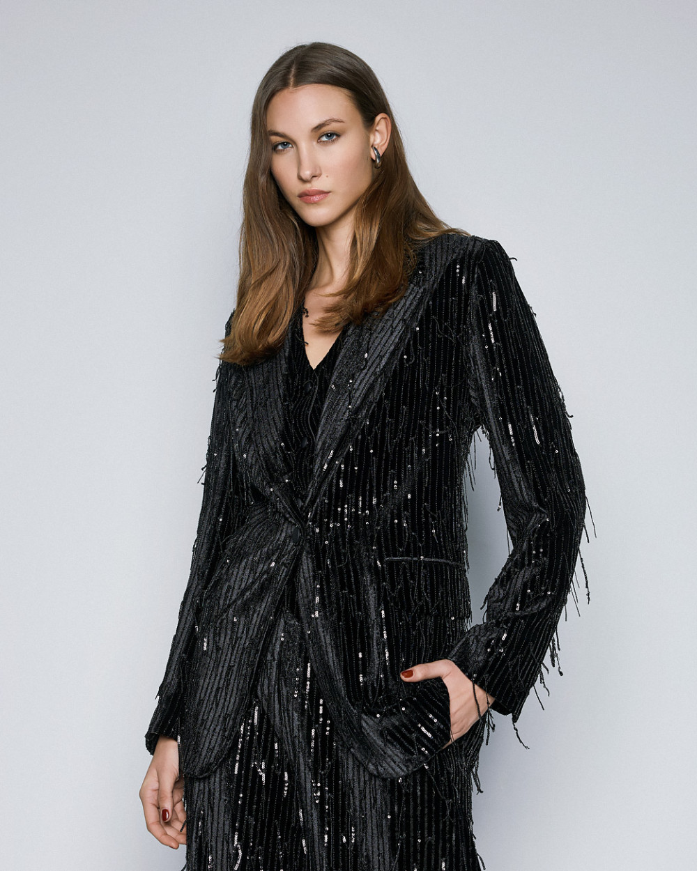 Velvet blazer with sequins and notch lapel collar. Features padded shoulders, front flap pockets and striking sequin fringes. Style with the matching trousers and/or waistcoat for a complete look.