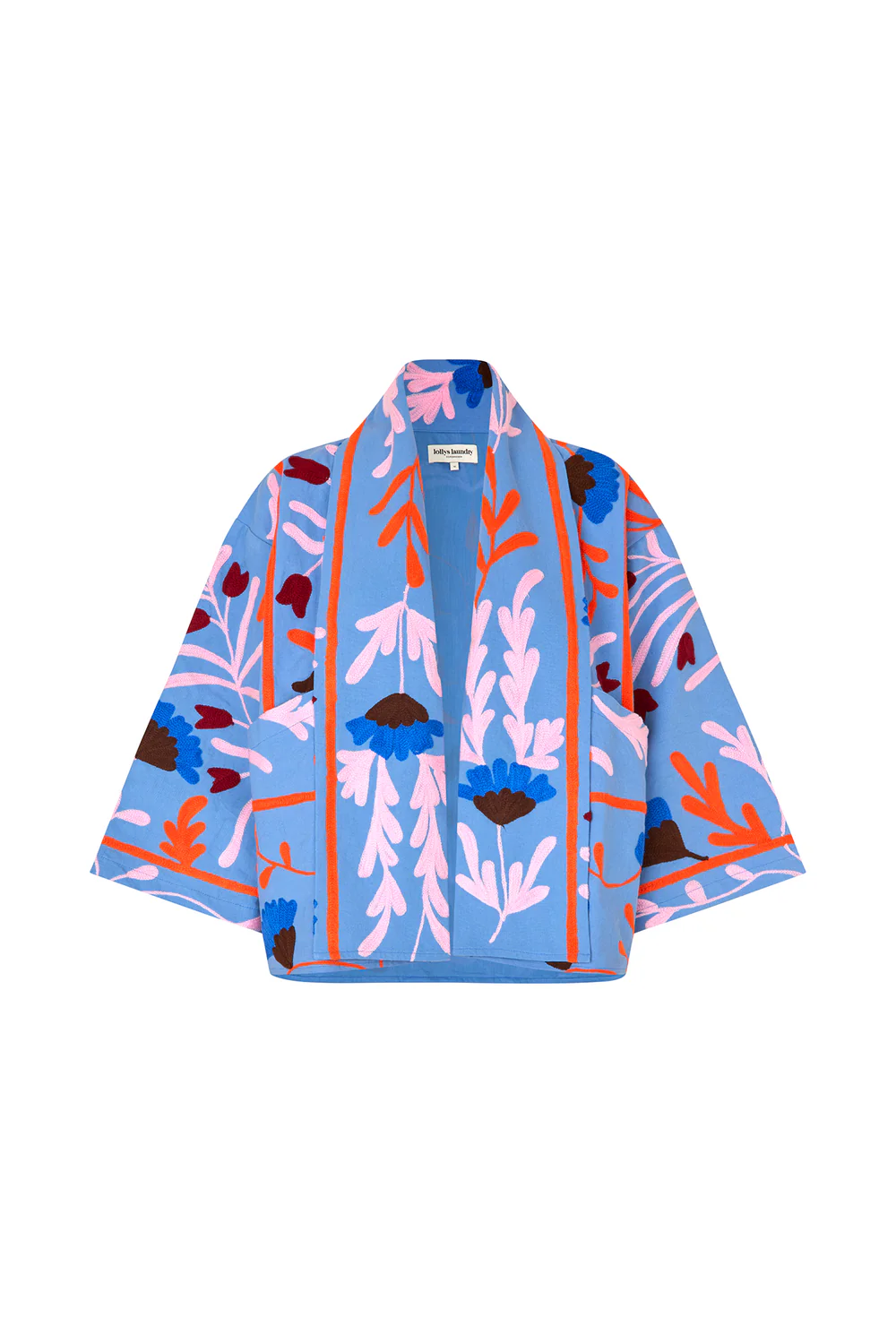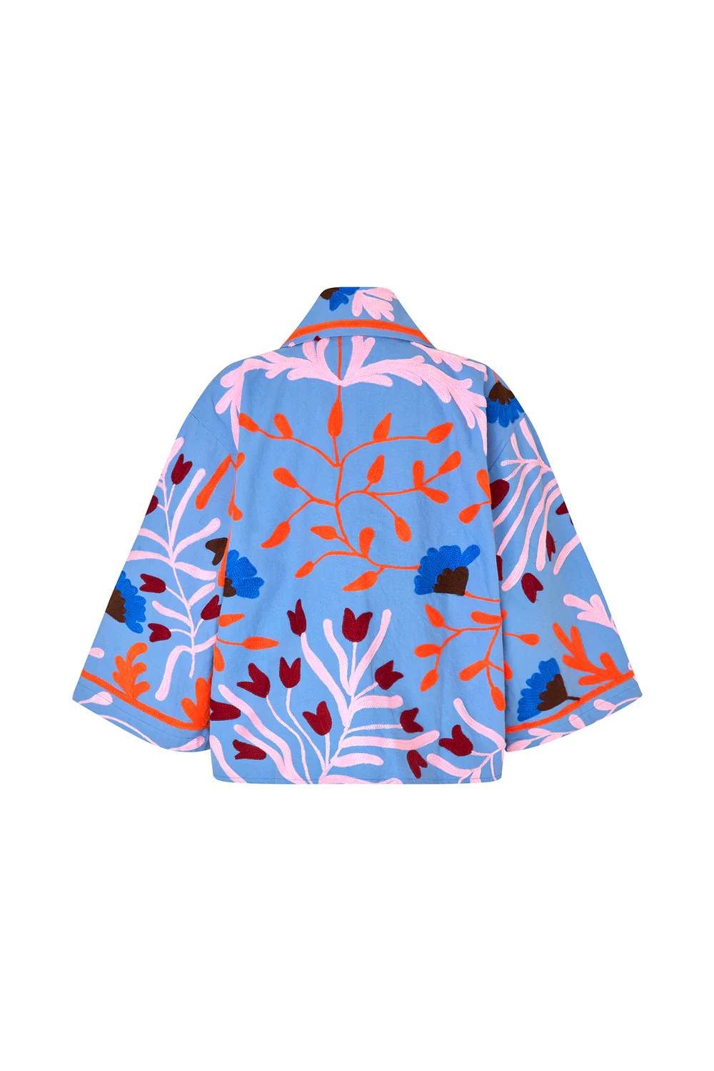 This jacket is a colorful artwork in itself. The large, hand embroidered flowers in vibrant contrast tones create a lively, bohemian inspired expression that elevates any outfit. The fit is light and kimono inspired with wide sleeves and an open front, making it perfect to throw over a simple tee, a dress or even a knit. A true statement jacket that brings creativity into your wardrobe.