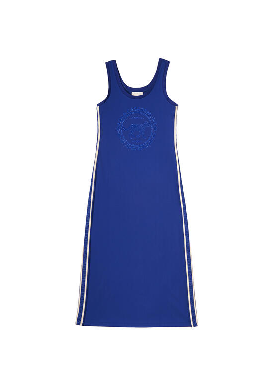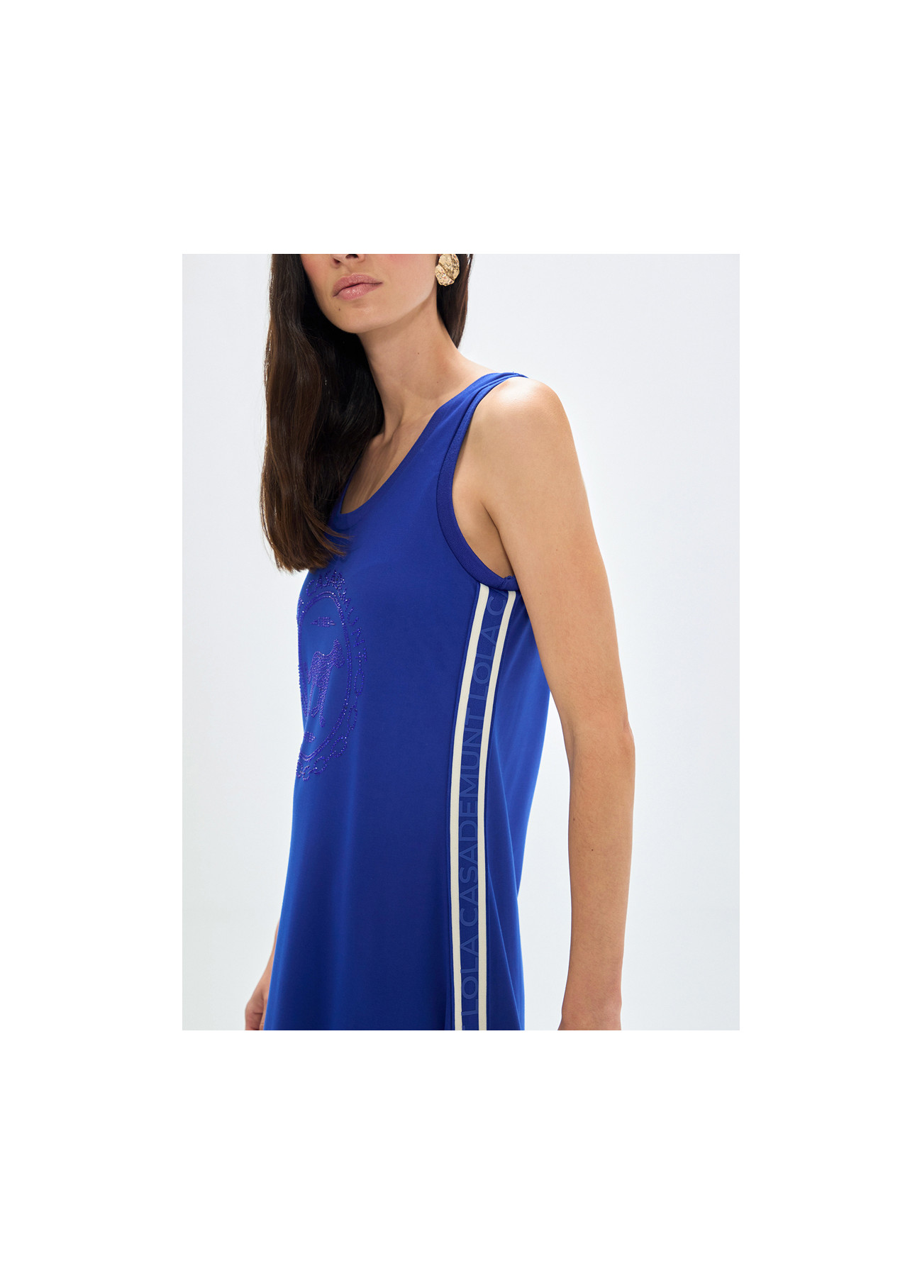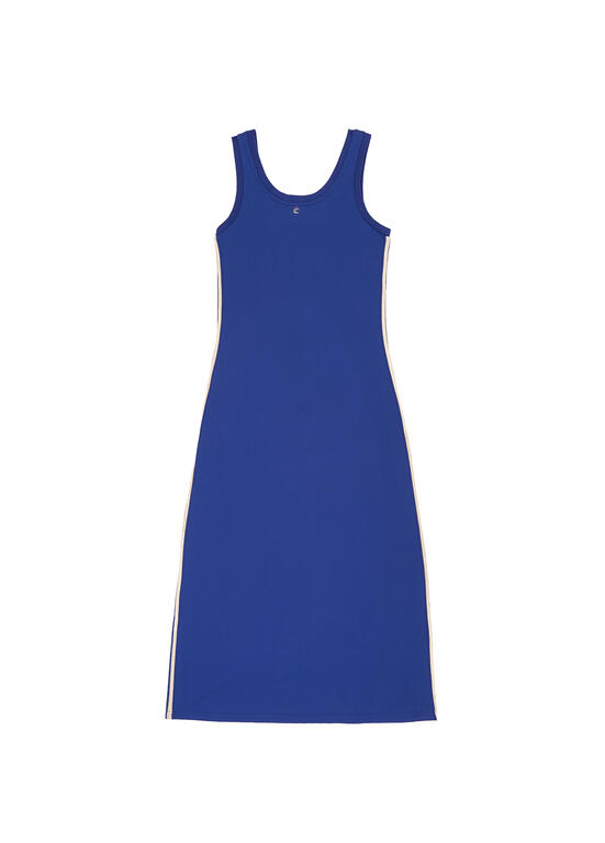 Sleeveless dress in vibrant blue with side stripe. Made from soft cotton for a comfortable fit. Sporty design with logo details and round neckline, perfect for a casual and modern look.