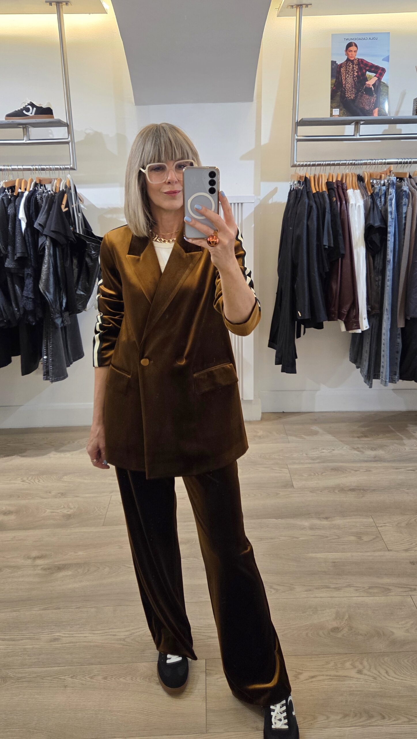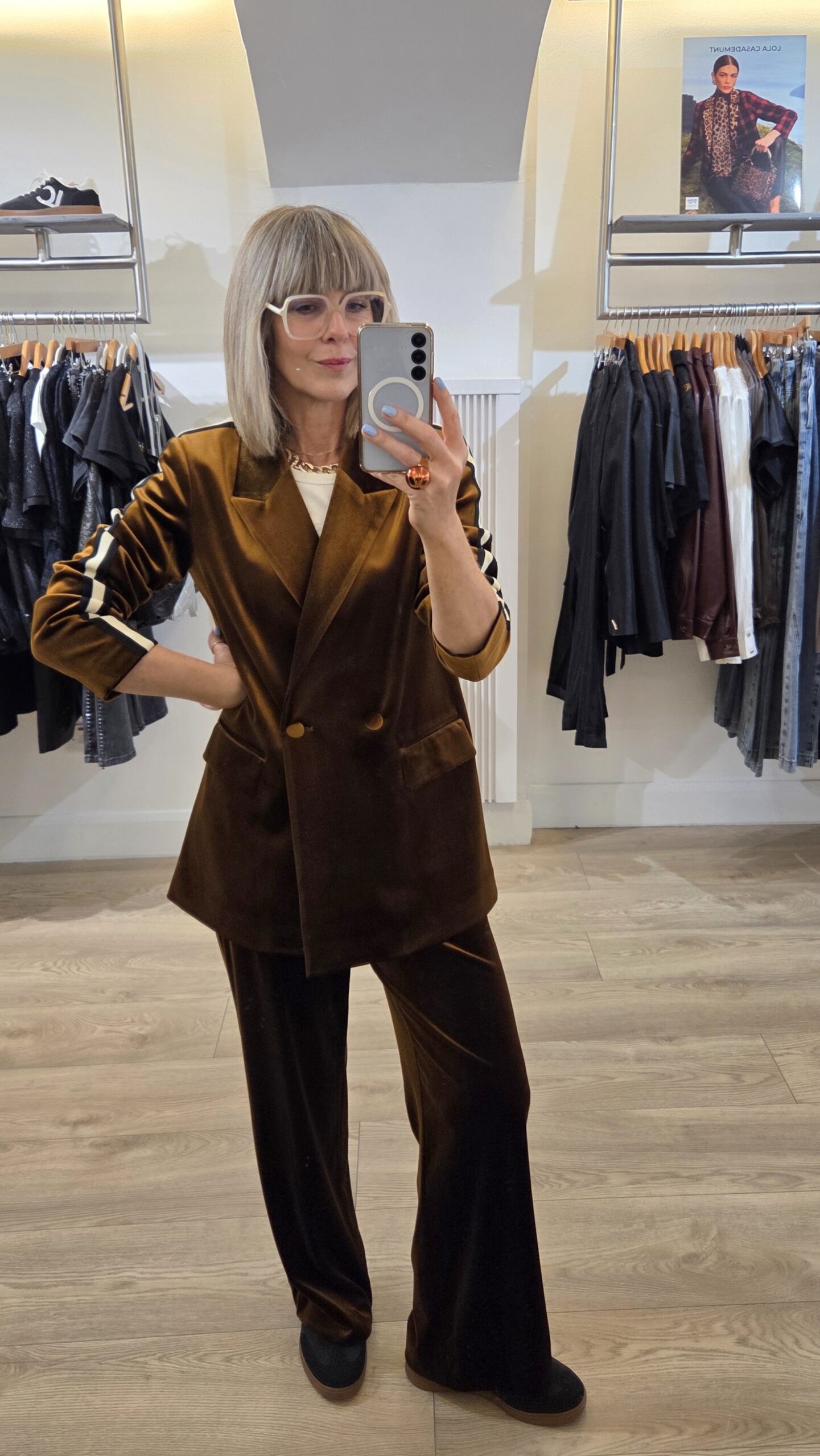 Bronze Velvet Blazer with Sporty Side Stripe and Slogan on the Back