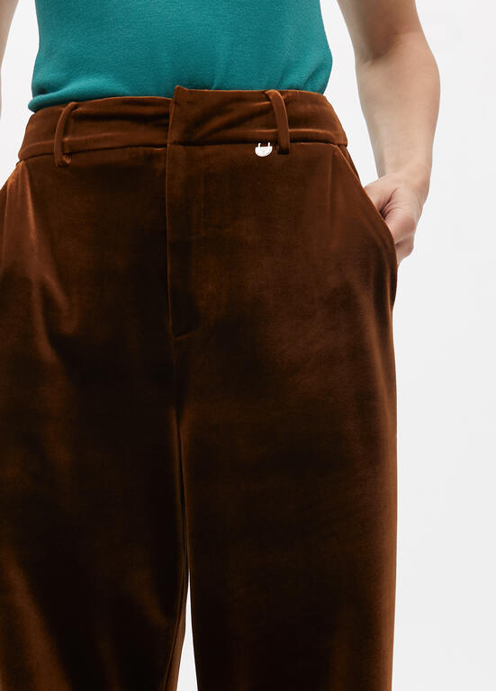 Wide leg pants in soft velvet. High waist with button closure and hidden zipper. Discreet side pockets. Style with the matching blazer or hoody for a complete look.