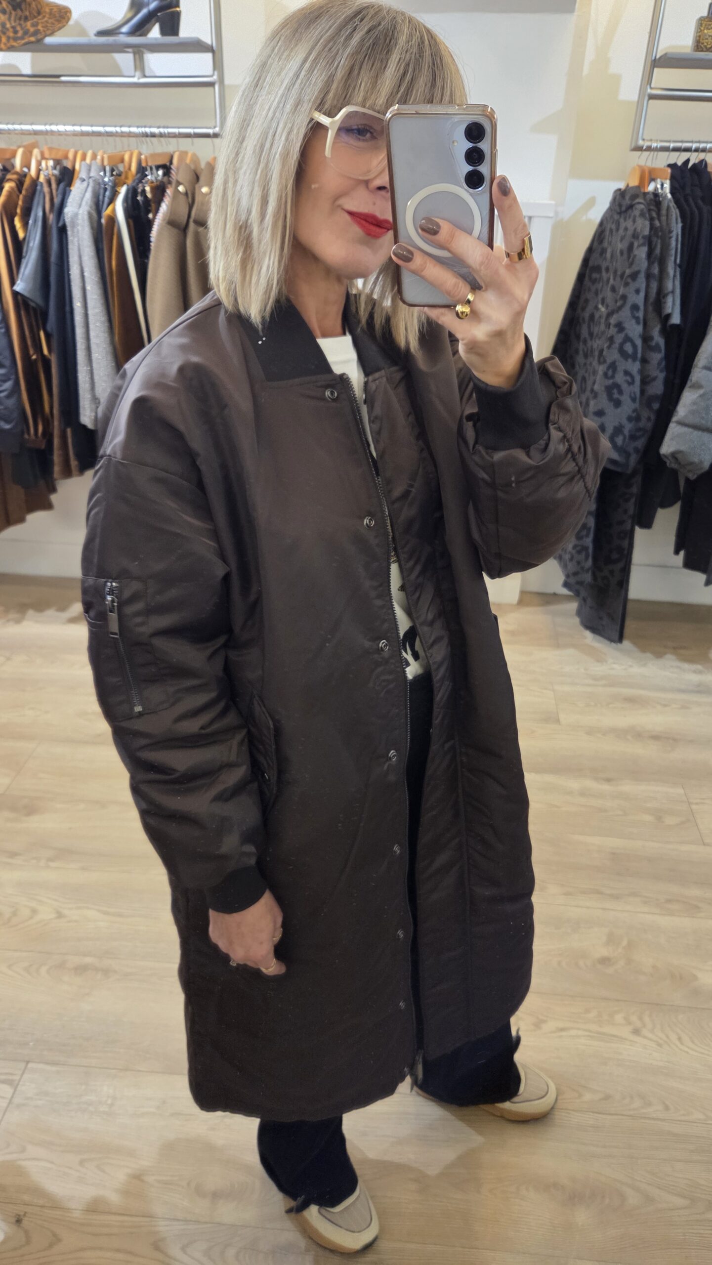 This long bomber coat offers a relaxed fit with a straight silhouette, ribbed cuffs and collar, and a mid-calf length. Designed for comfort and versatility, it provides stylish warmth for everyday wear.