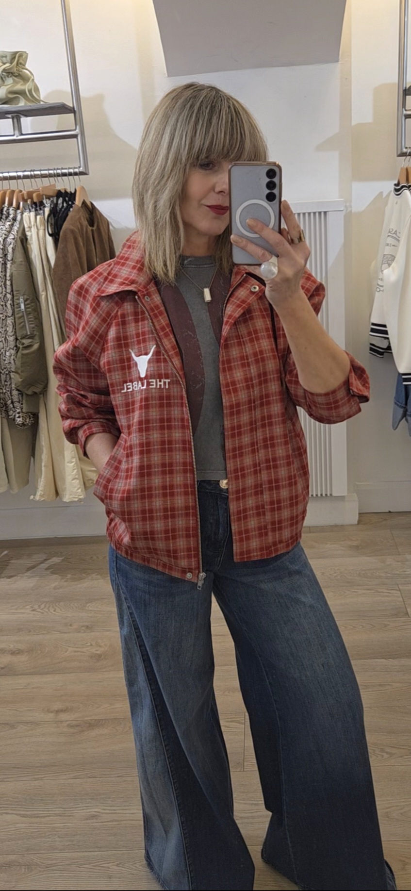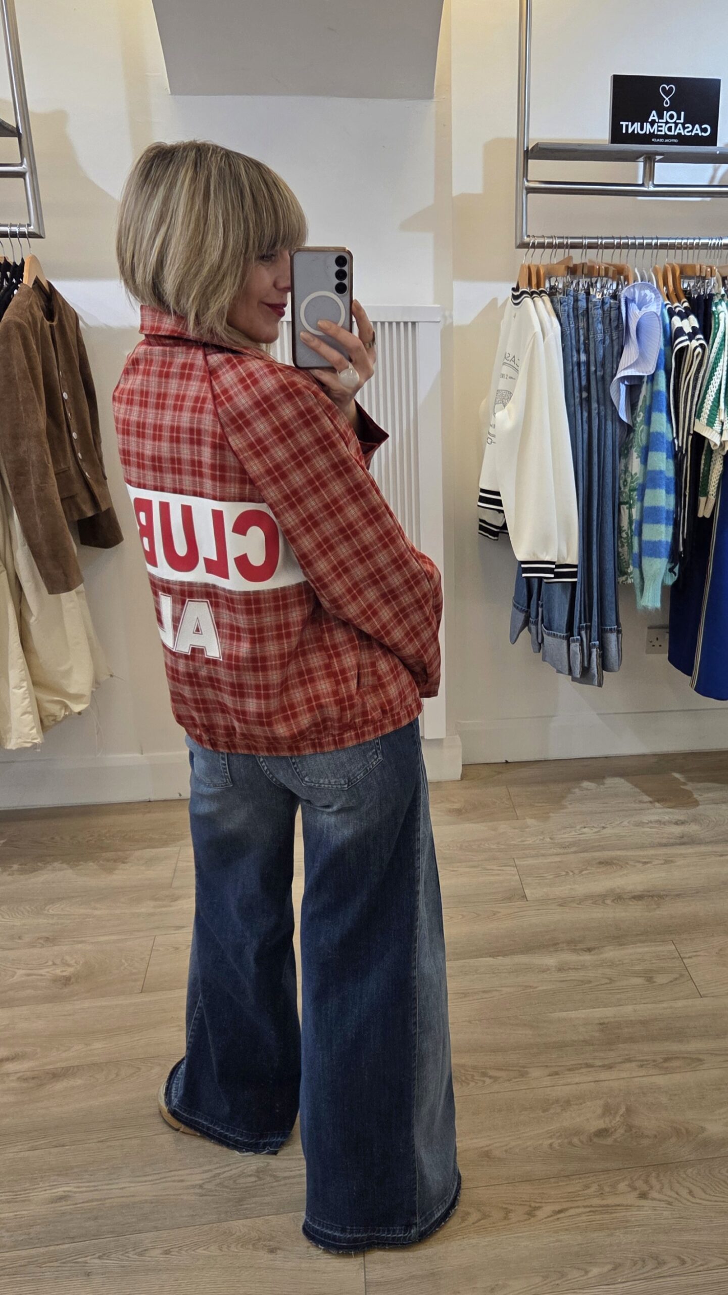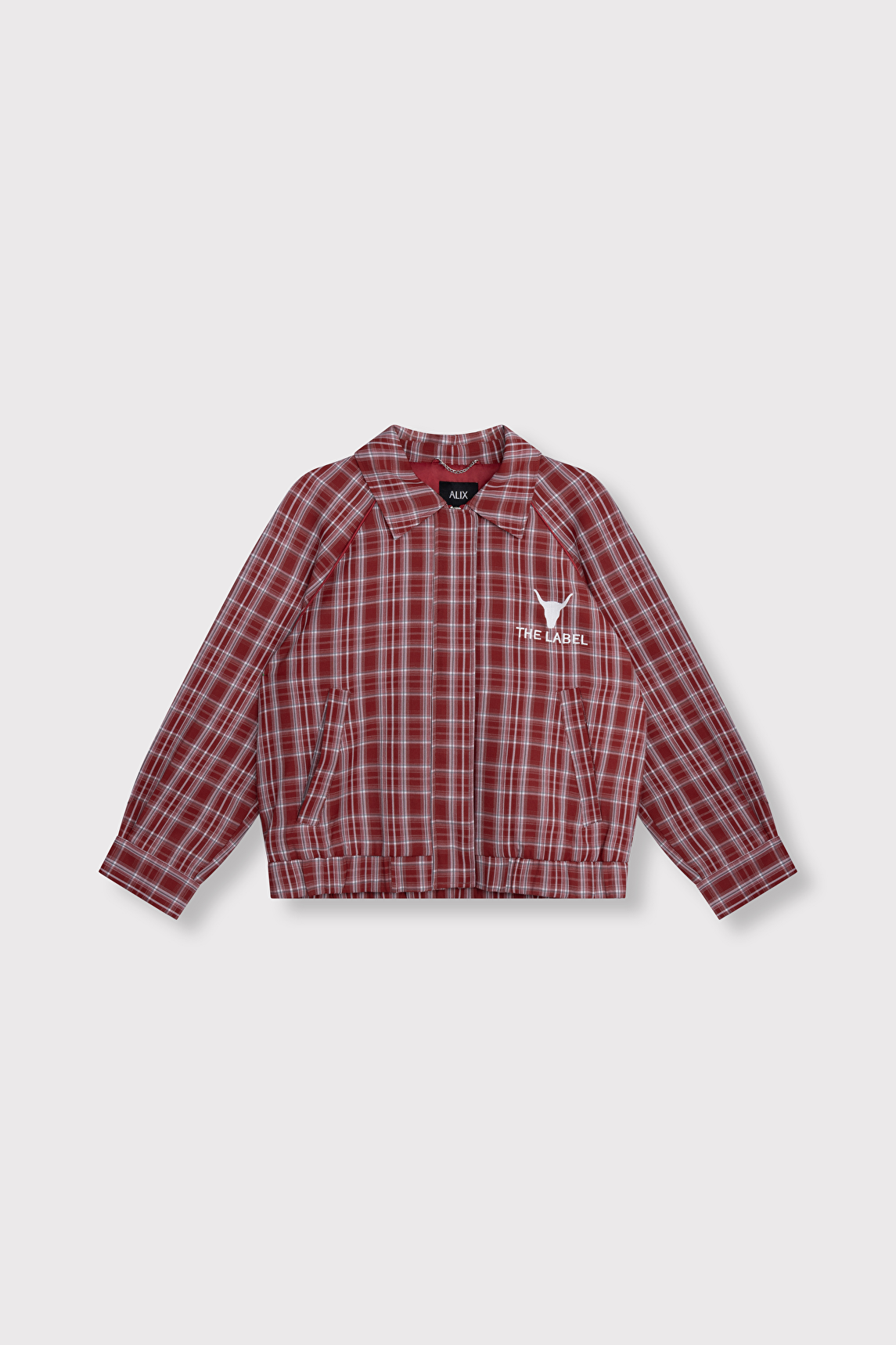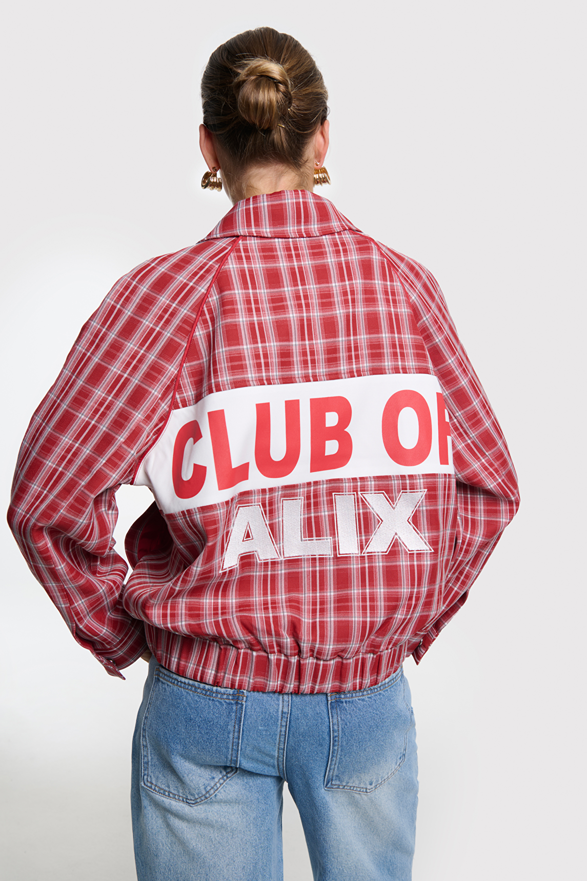 Cherry Red Check Bomber Jacket with Slogan on the Back ‘Club of ALIX’