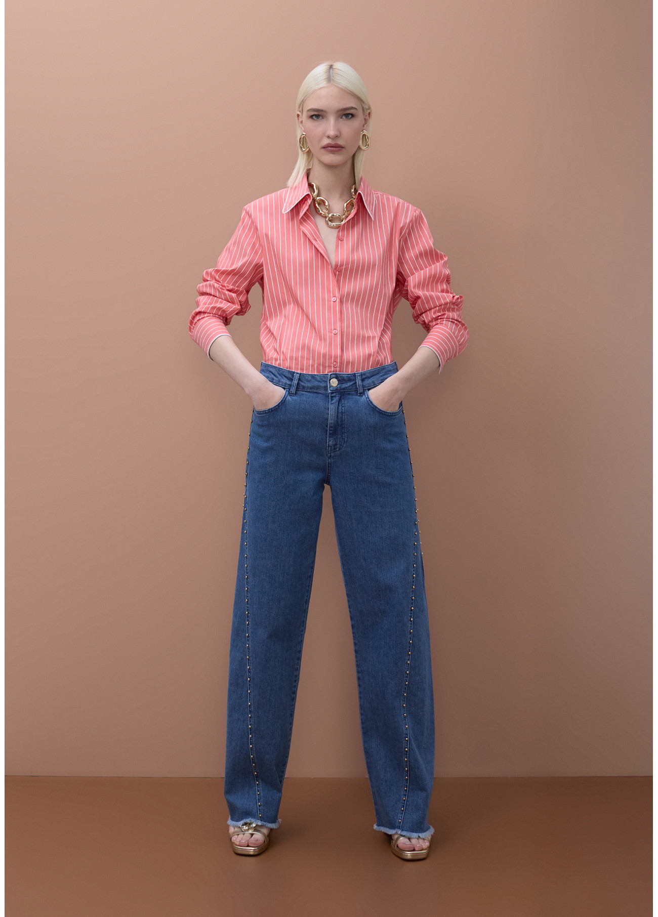 These straight-cut jeans feature elegant gold studs on the sides. Crafted from high-quality denim, they offer comfort and style, ideal for a modern and sophisticated look. Style these super jeans for day or night.