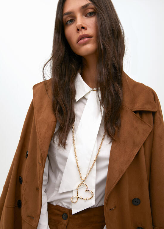 Elegant necklace with fine chain and intertwined heart and infinity pendant. Gold finish and simulated pearl details. Adjustable closure.