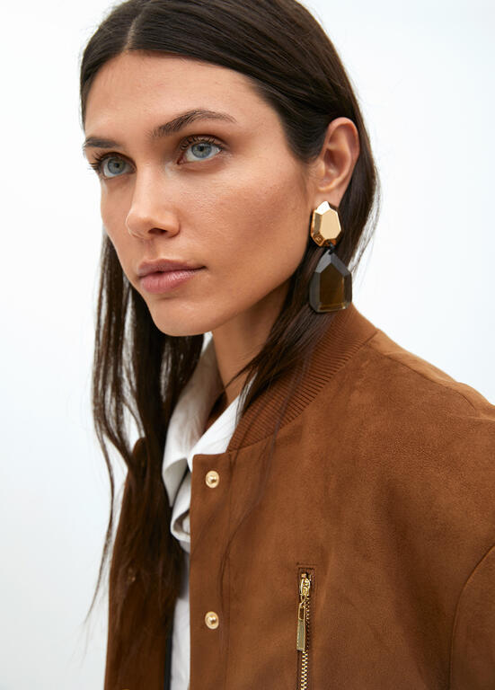 Geometric earrings with metallic and translucent resin elements. Lightweight and sophisticated with a push-back closure. Perfect to elevate any look.