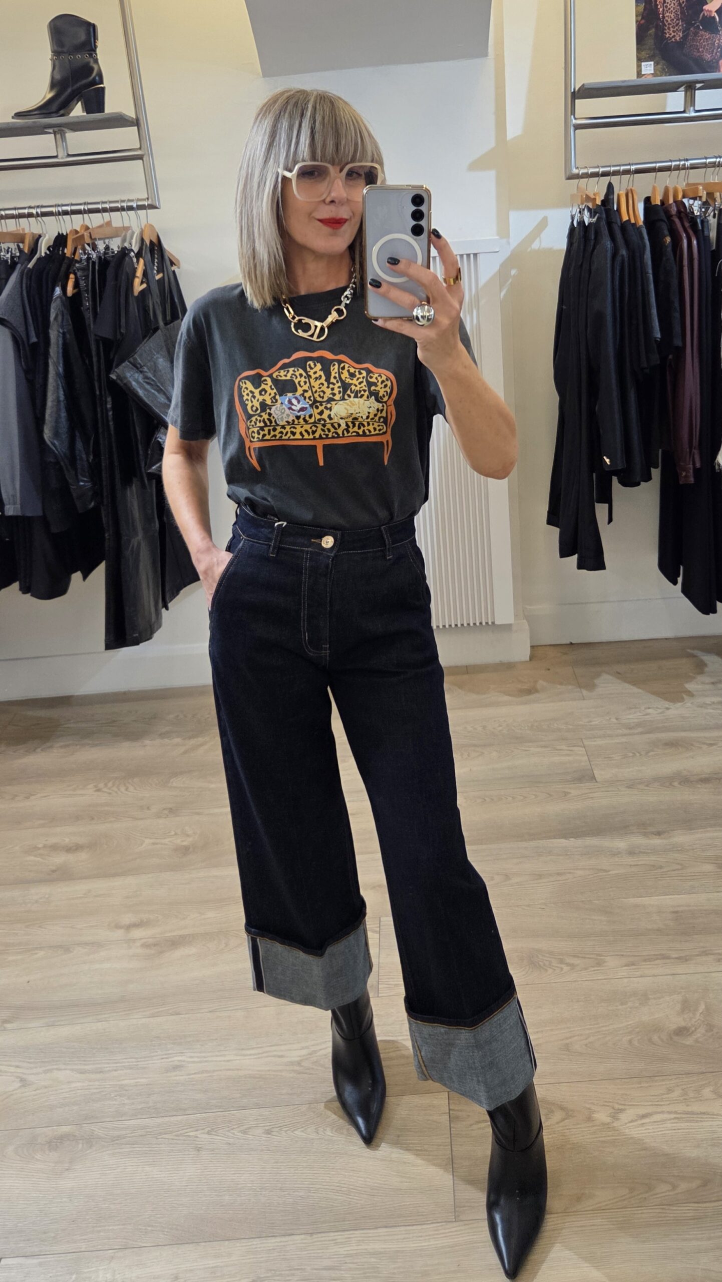 Jeans flare cropped made in denim with dark wash. French pockets and turn-up.