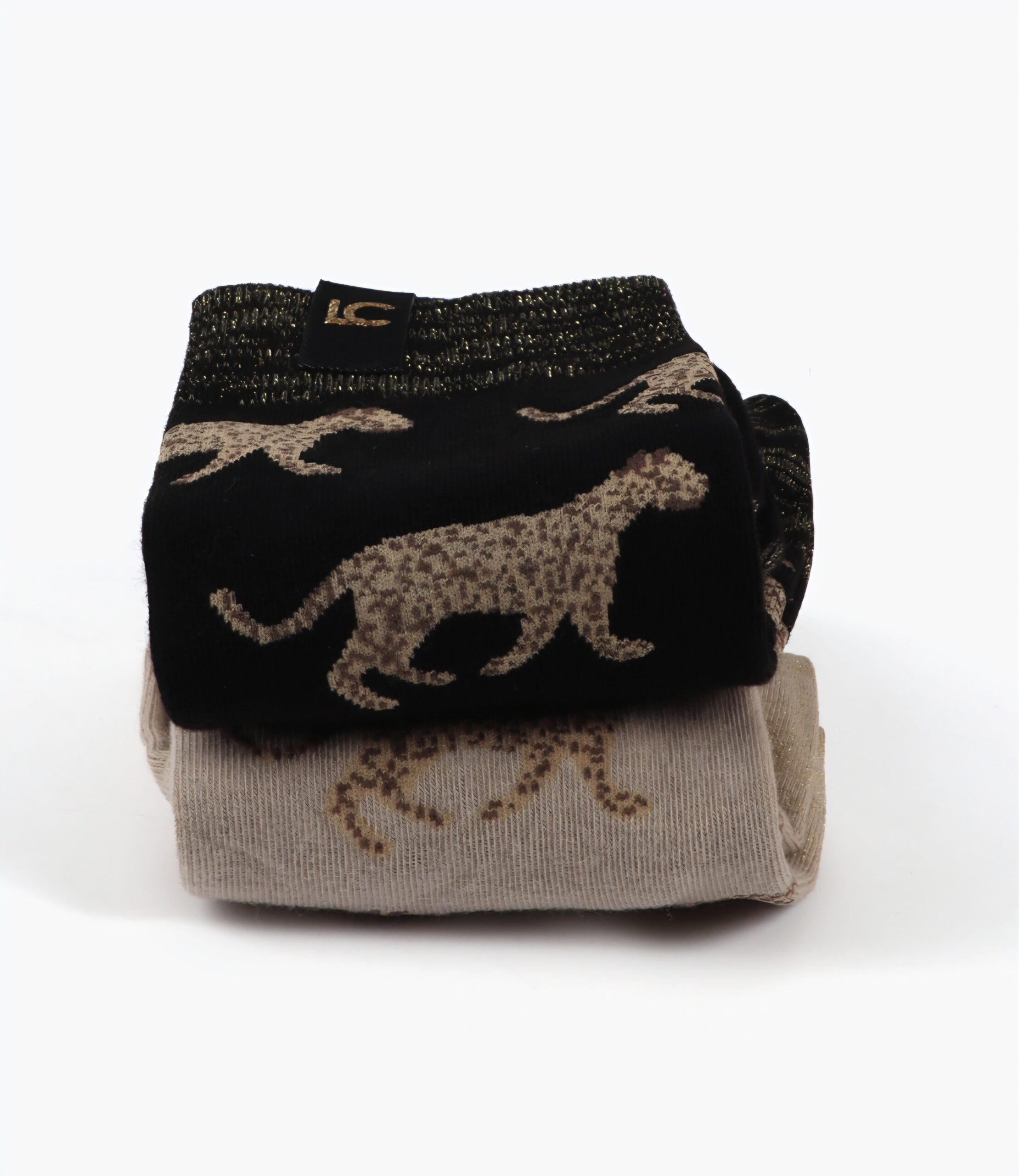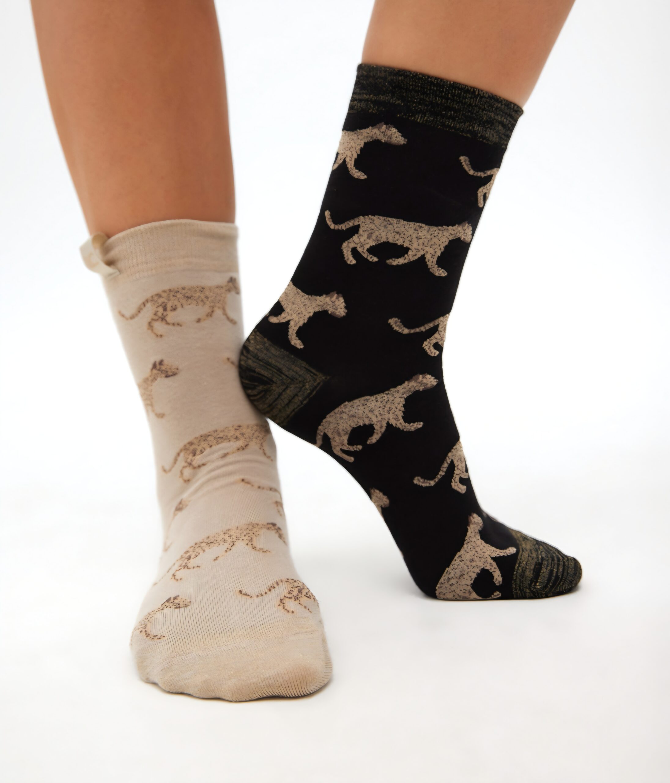 Pack of soft cotton socks with leopard print. Includes two pairs: one in beige and one in black. Add a modern touch to any look with their exclusive design and stretchy edge for a perfect fit.