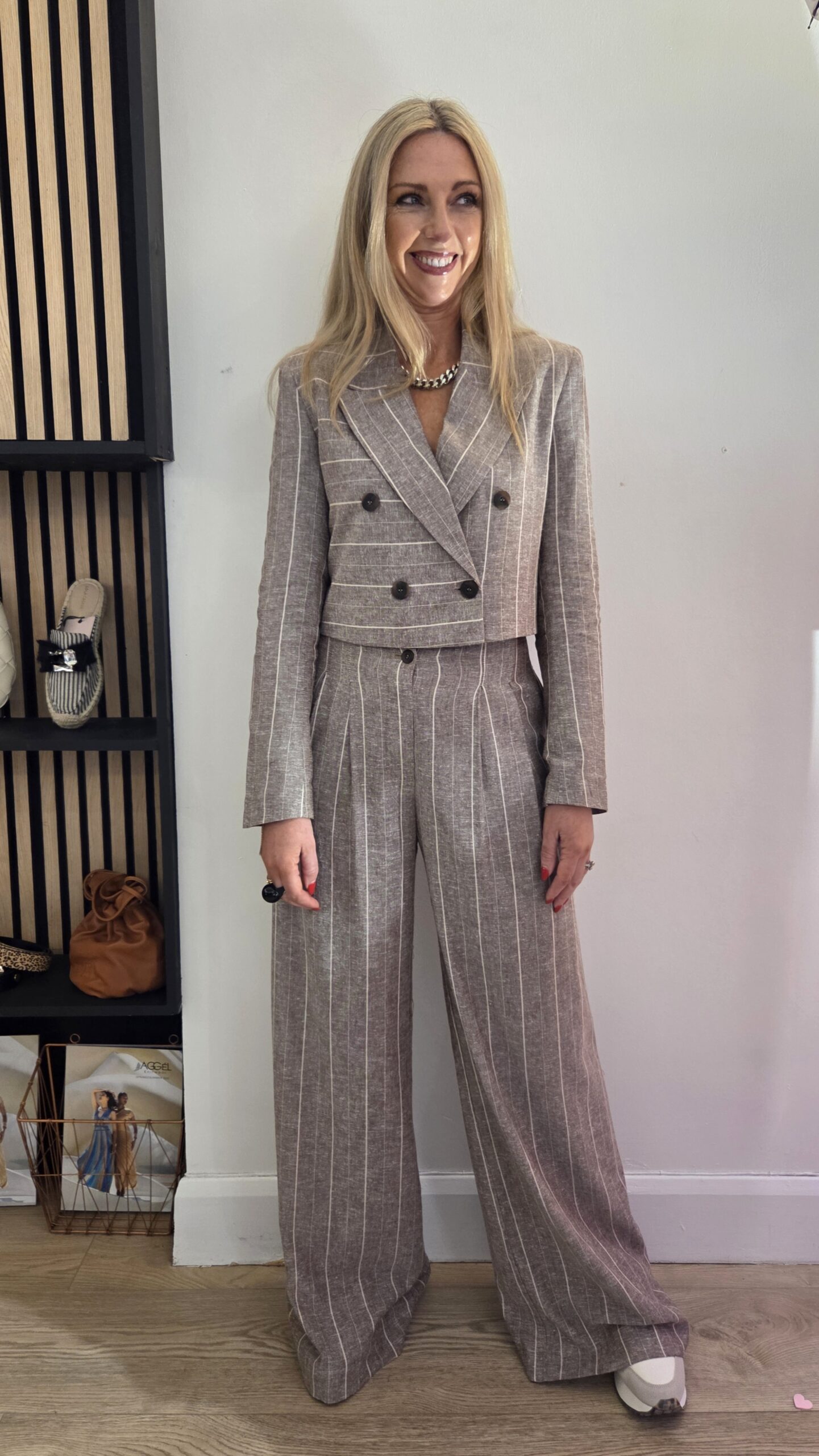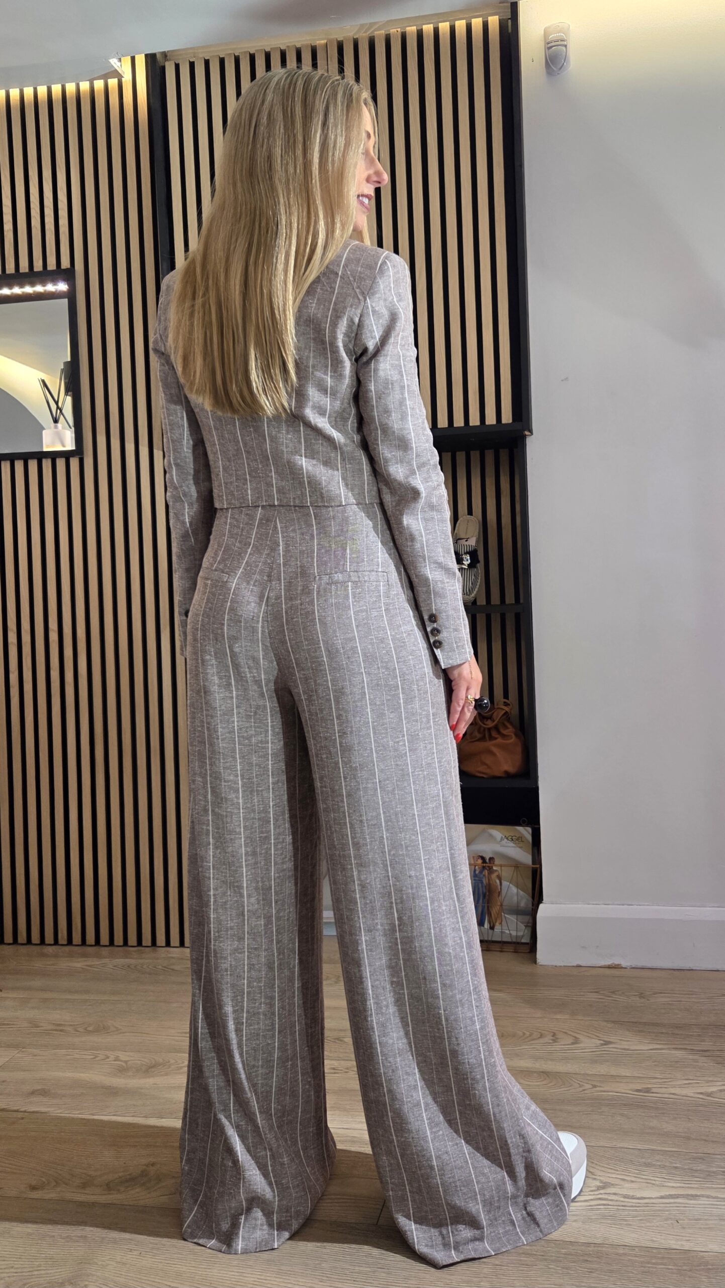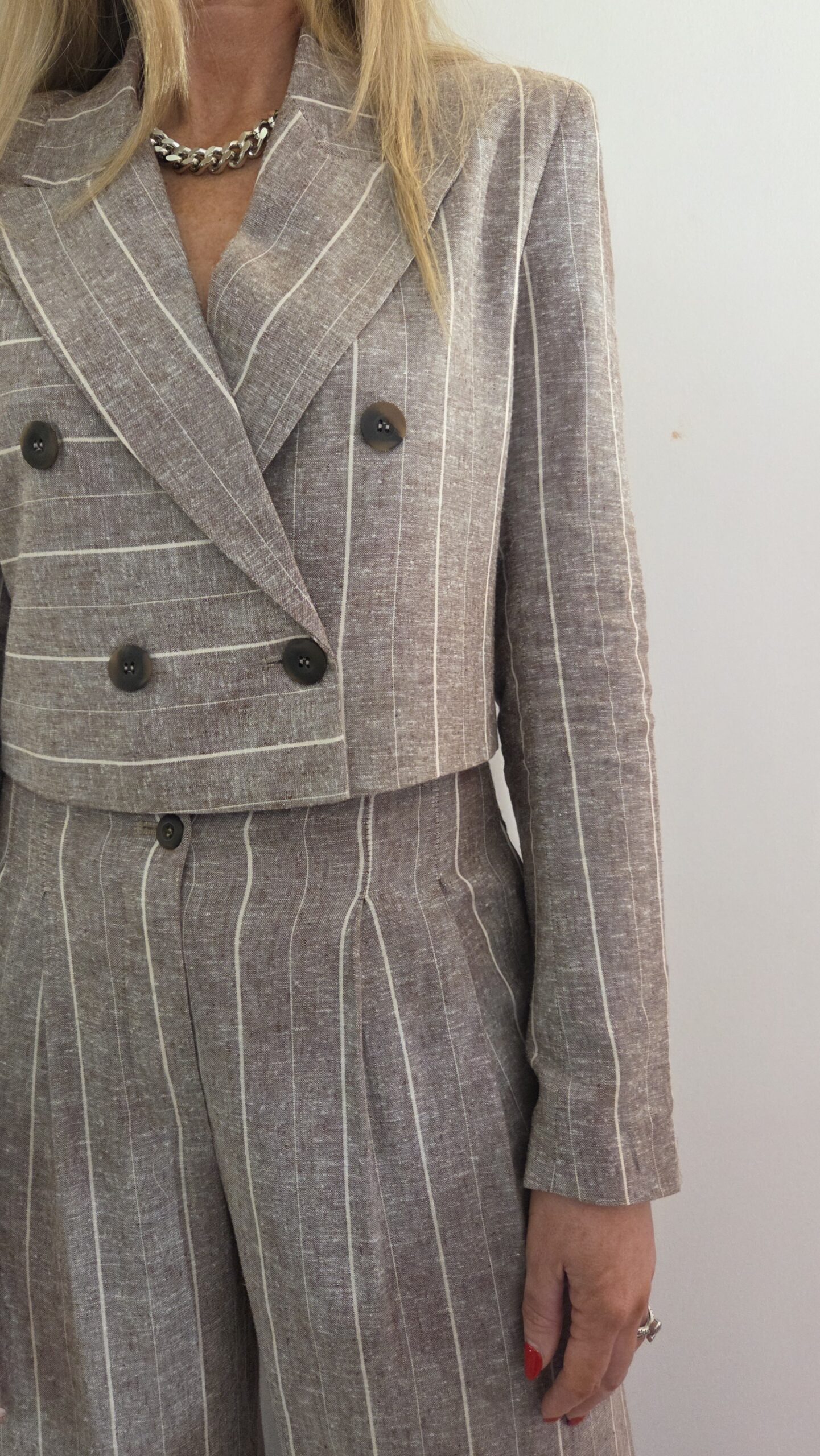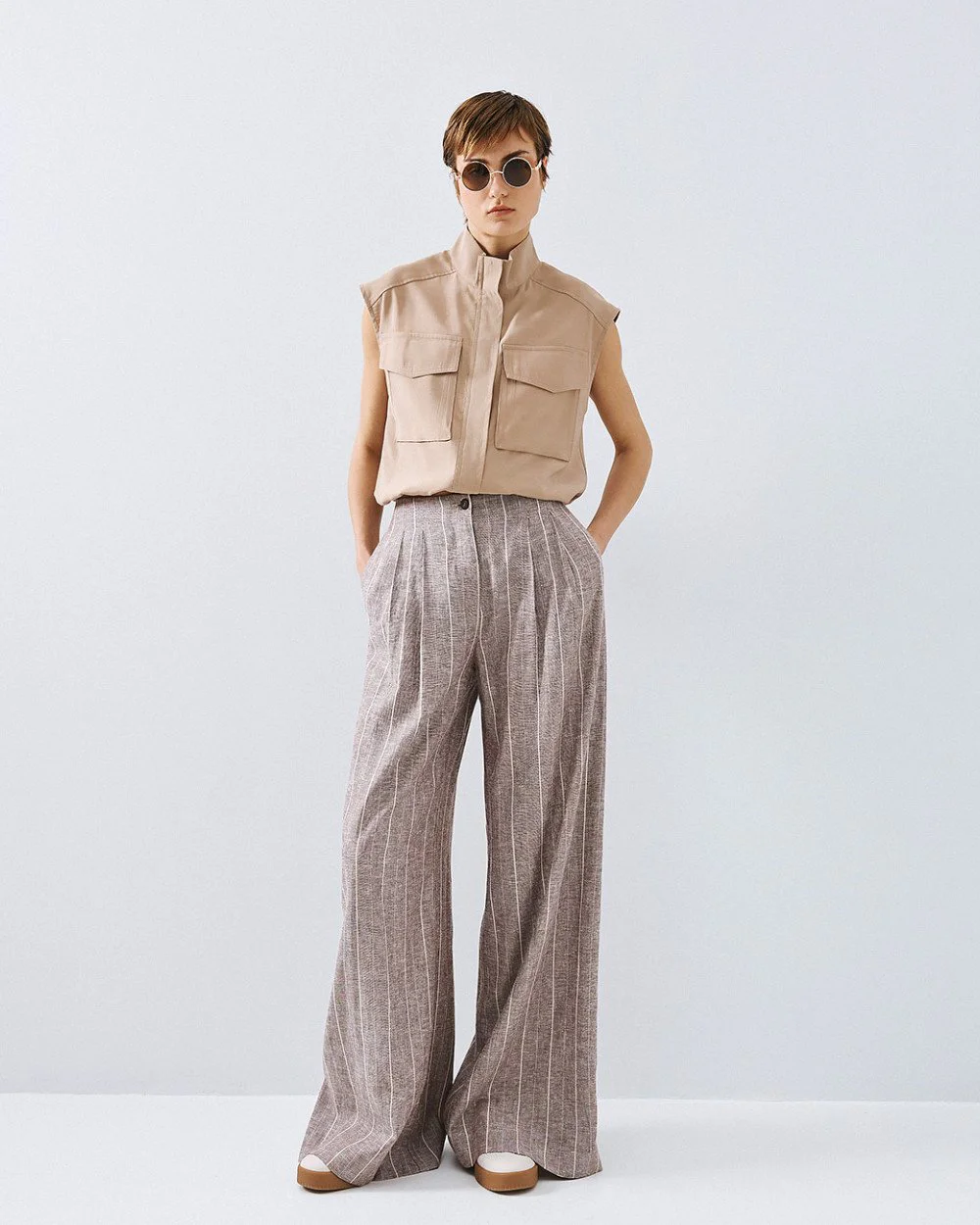 High-waisted striped pants with side pockets and decorative welt pockets at the back. Designed with pleats and a front closure with zip and button. Pair with the matching blazer for a complete look.