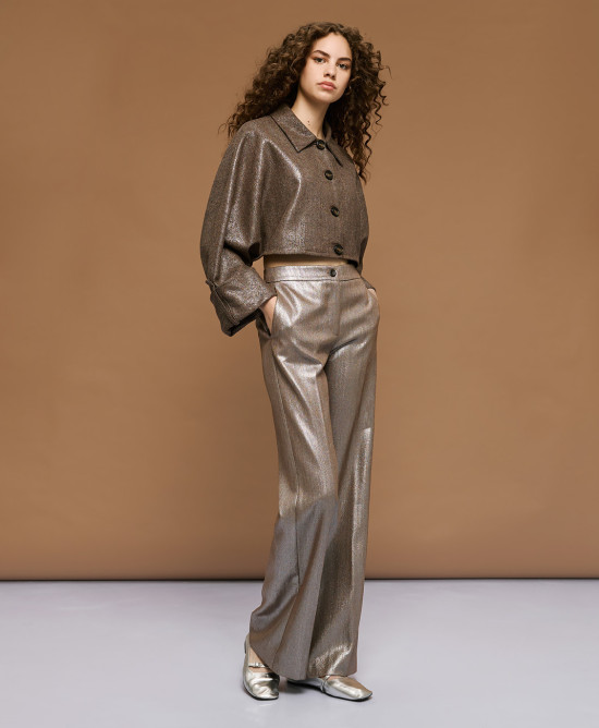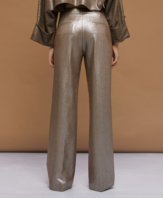 Wide-leg metallic-effect pants with side pockets and front zip and button closure.