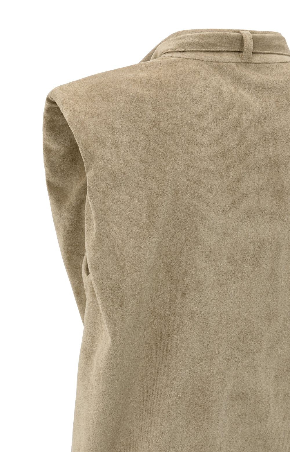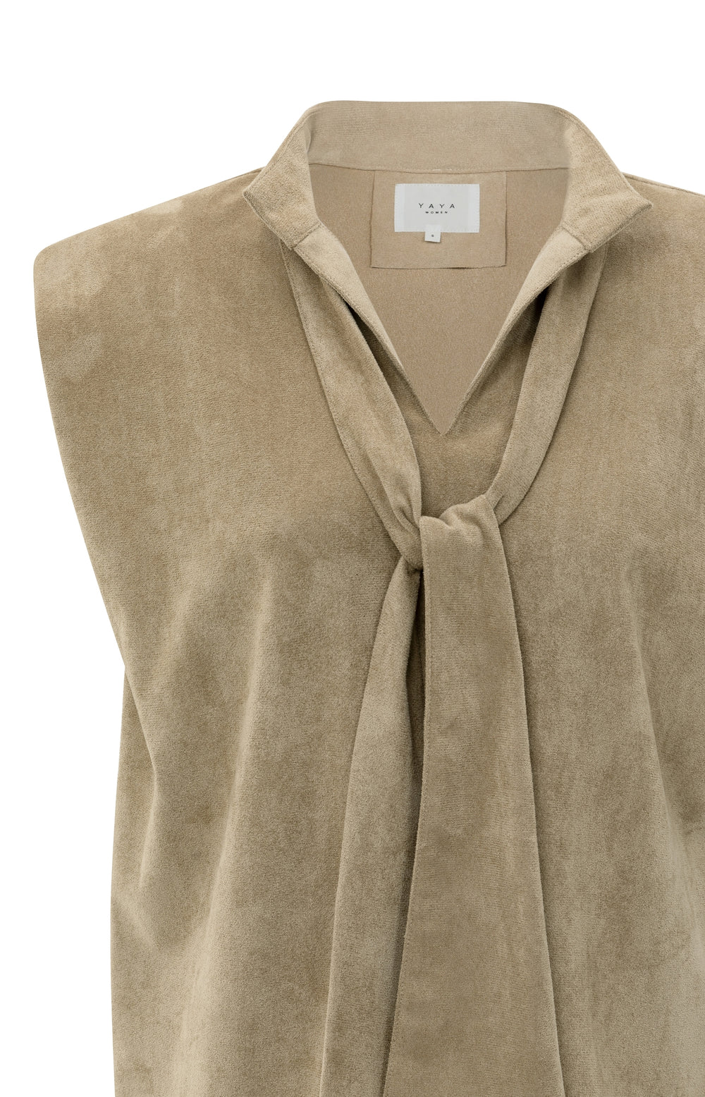 This elegant sleeveless top is crafted from soft suedine and features a refined tie at the neckline. The smooth fabric gives it a luxurious look, while the loose fit ensures comfort. Finished with a neat stand-up collar and tie detail, its a perfect piece for layered looks.