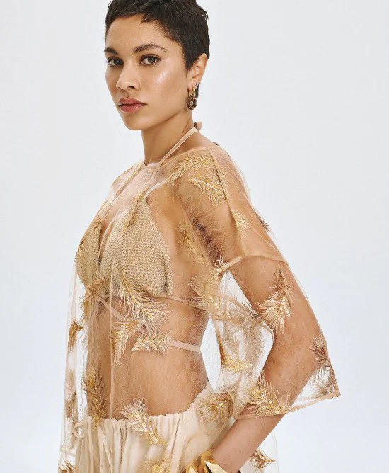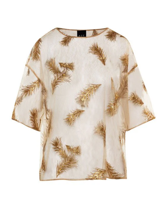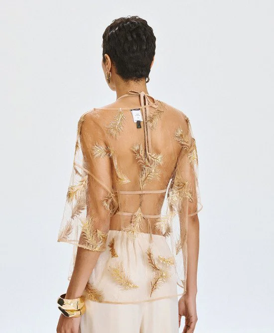Sheer Top with Gold & Bronze Sequin Feather Applique