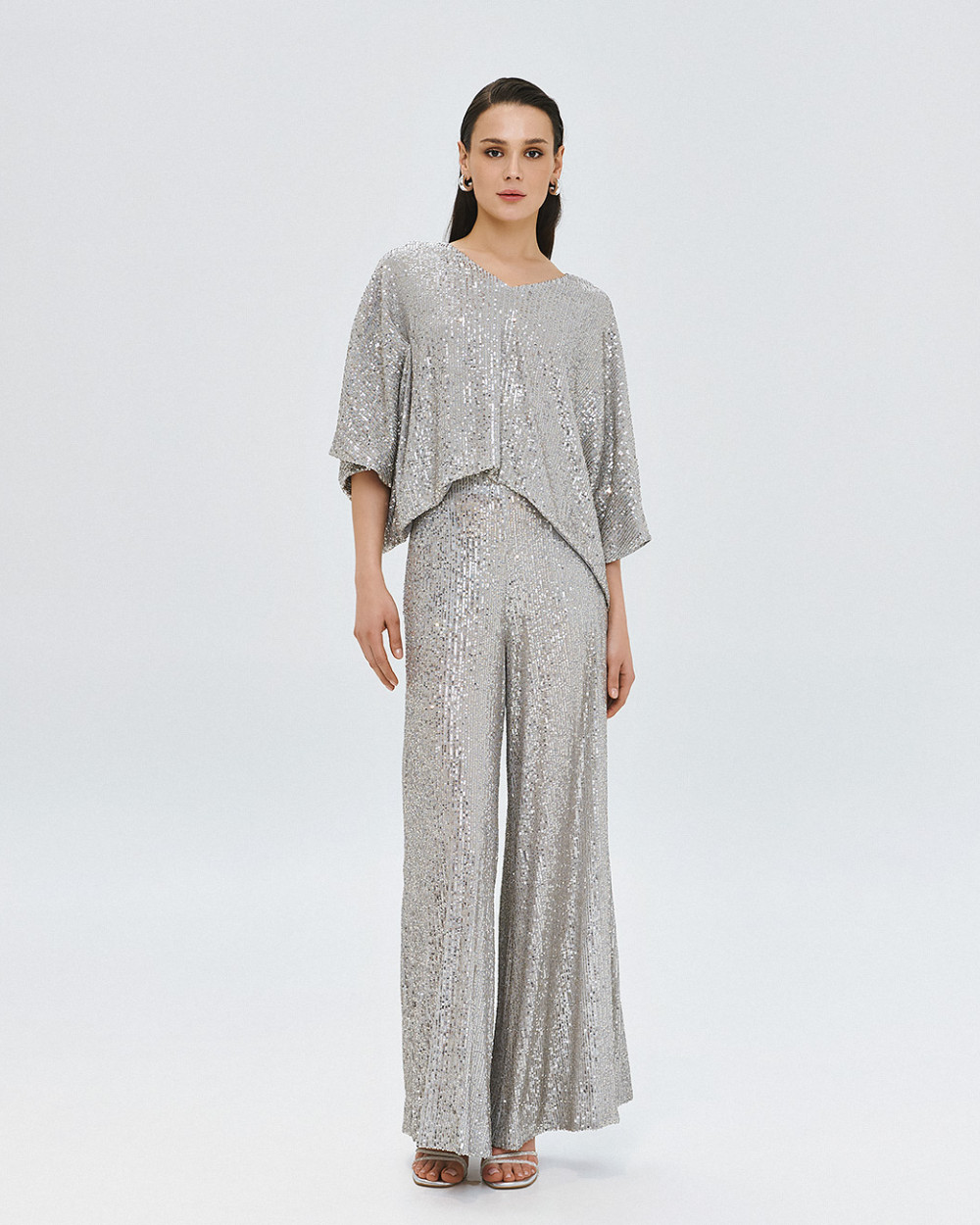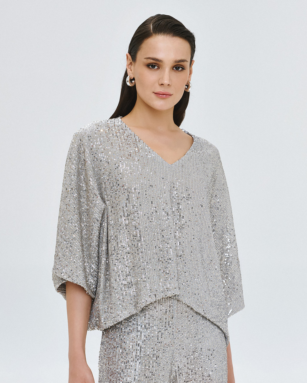 One size sequin blouse. Features a V-neckline and batwing sleeves. Style with the matching trousers for a complete look or dress down with jeans or white wide-leg trousers for an effortless going out look.