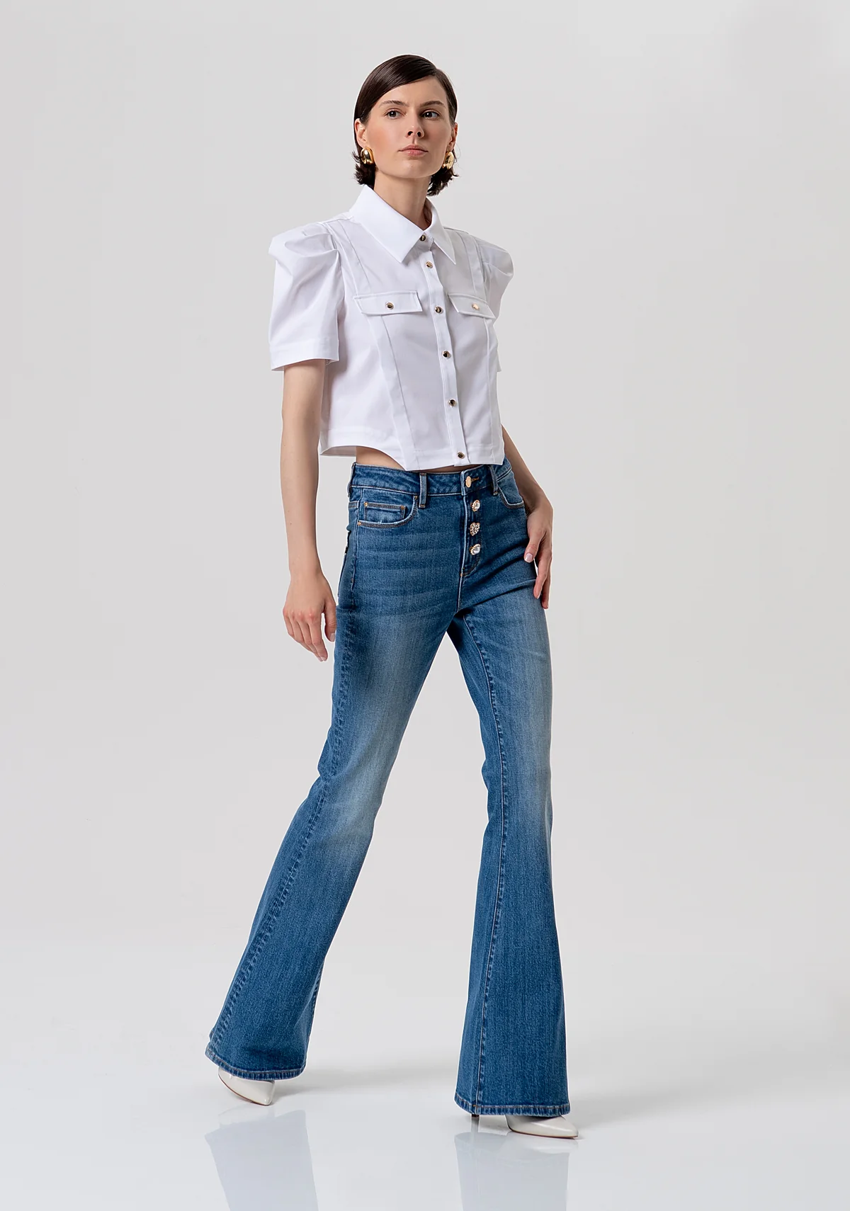 White Cropped Short Sleeved Shirt with Metallic Silver Buttons
