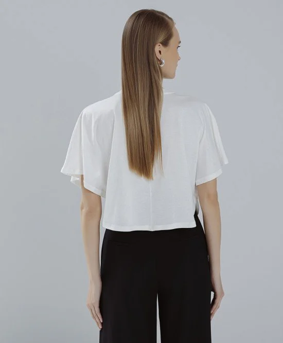 Cropped T-shirt with short sleeves, front embroidery, and a rounded hem.