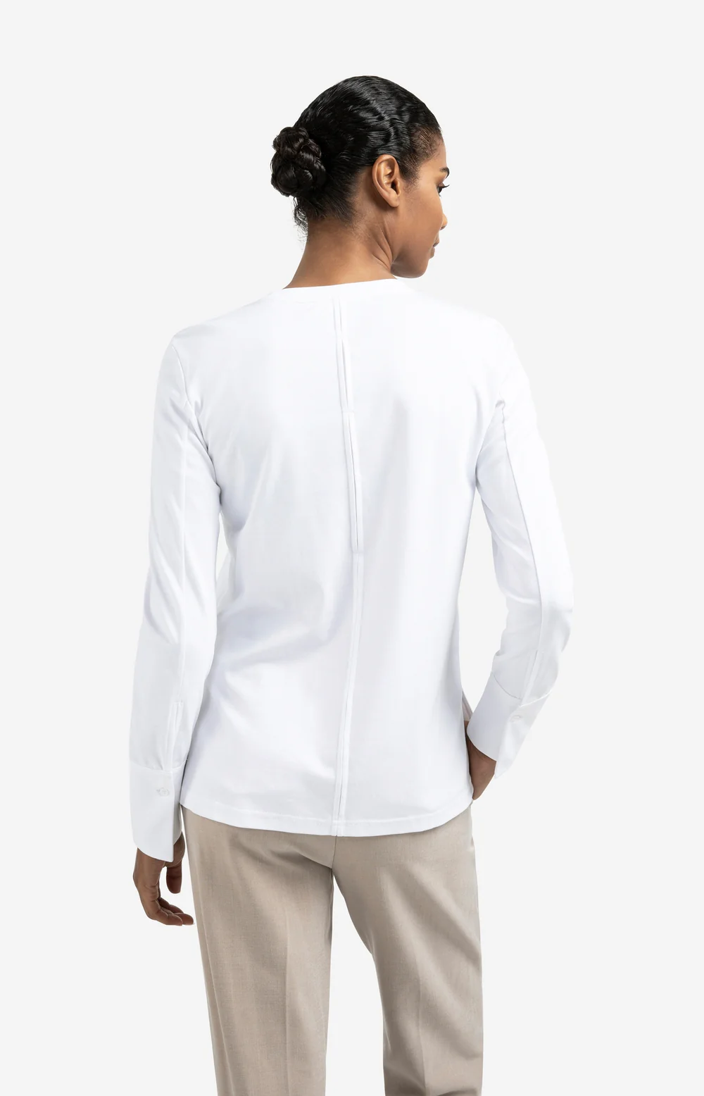 This elegant jersey top features a regular fit, long sleeves, and a round neckline. The soft stretch fabric offers comfort, while the woven cuffs with button detail add a refined touch. A back seam and subtle side slit complete the design. A versatile essential, perfect for both casual and stylish looks.