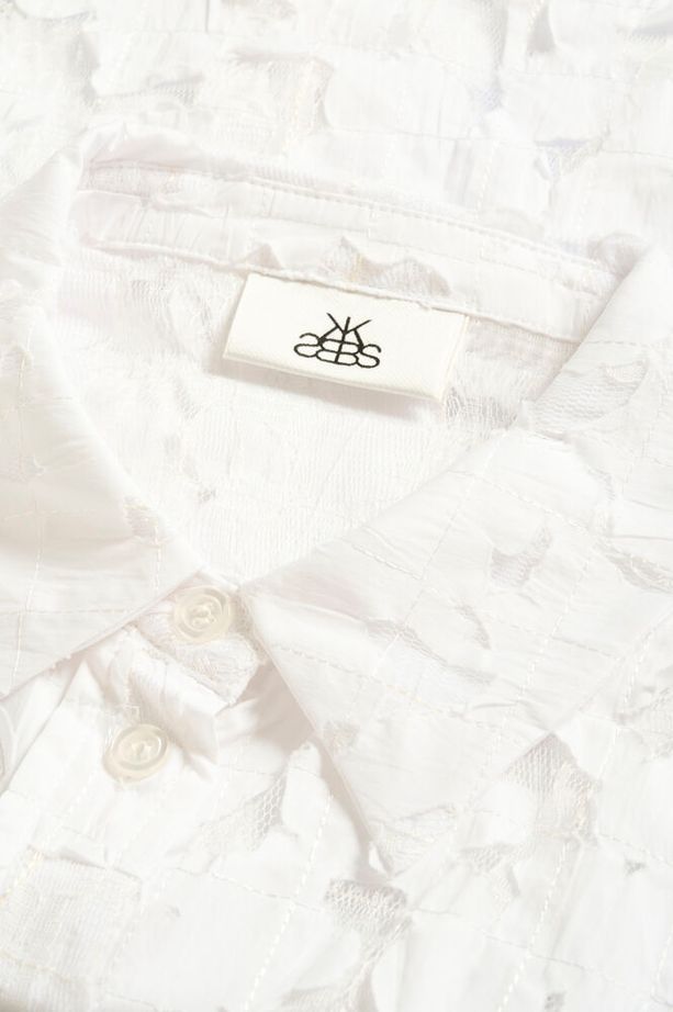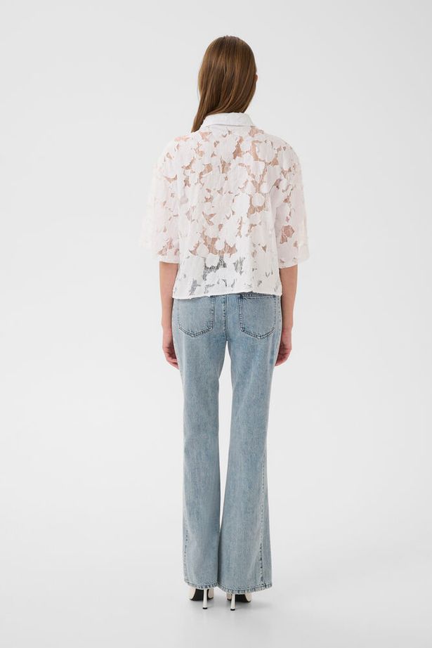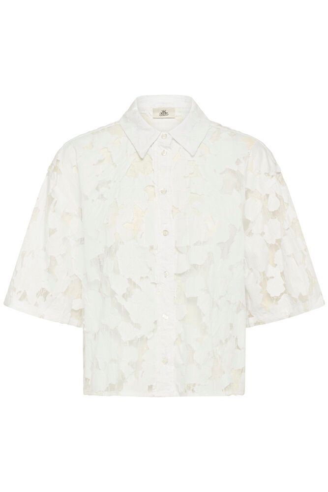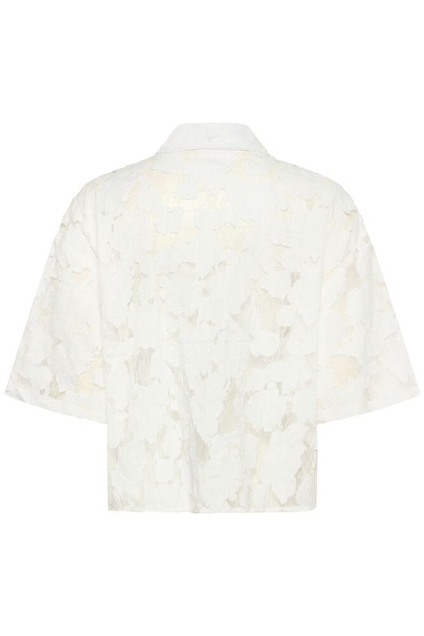 White Short-Sleeved Semi-Sheer Shirt with Applique Flowers