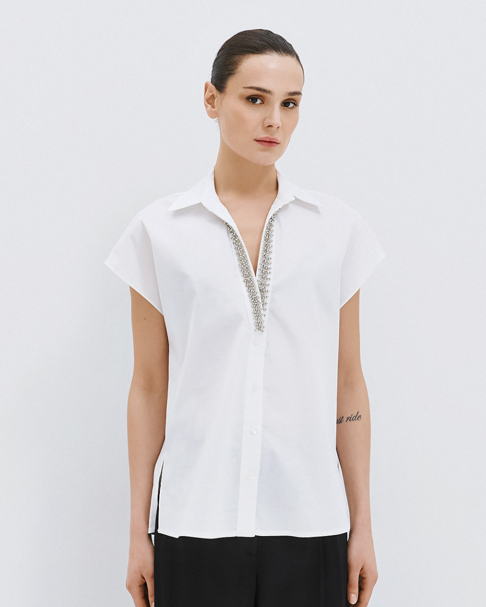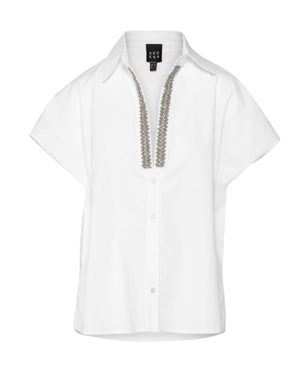 White Short-Sleeved Shirt with V-Neckline & Silver Bead Embellishment