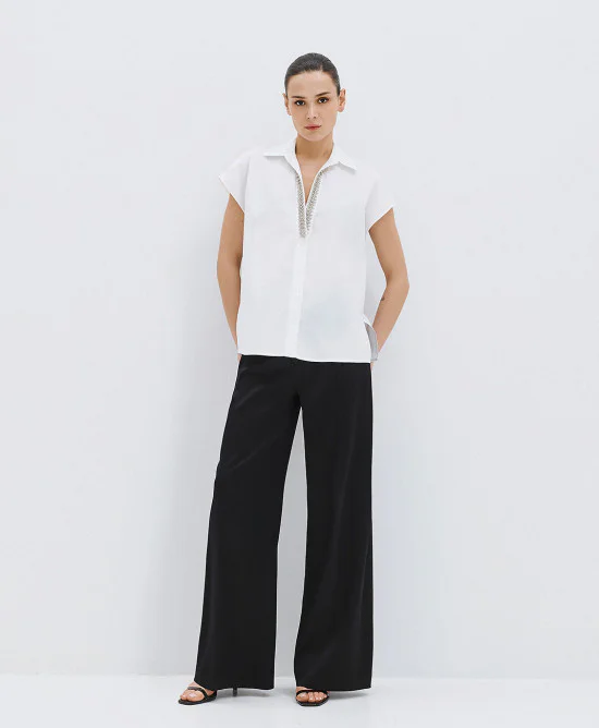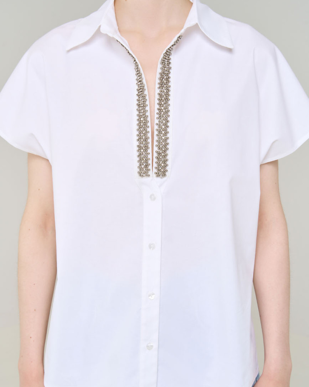 Shirt with short sleeves, a collar and a V-neckline. Features metallic silver embroidered beads at the neckline and a front button fastening.